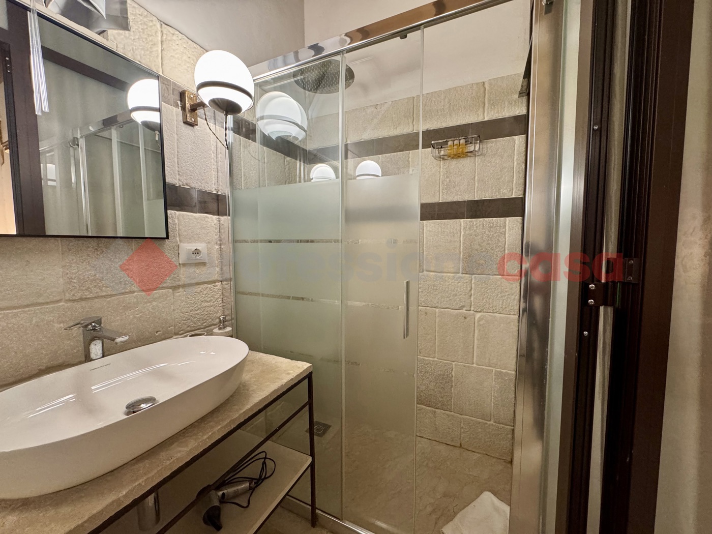La zona notte, ospita una camera da letto, servita da un elegante bagno dotato di box doccia walk-in, rifinito con soluzioni moderne che si integrano armoniosamente con il contesto storico.