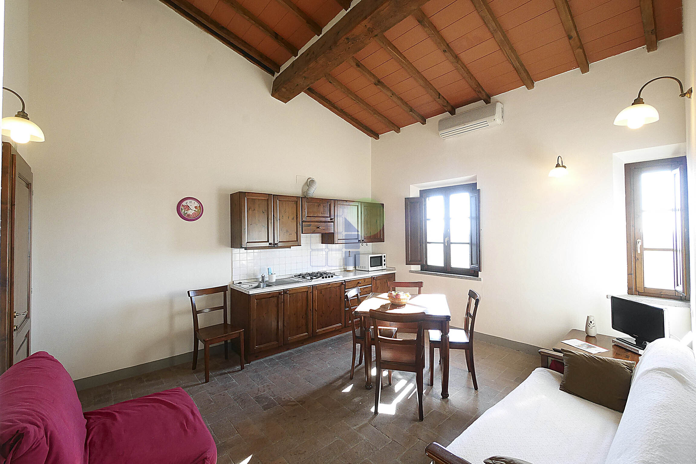 Le travi a vista e la pavimentazione in cotto aggiungono carattere tipico toscano.