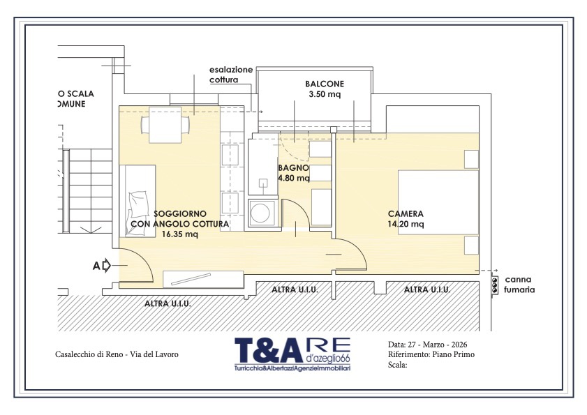 L'immobile di 46,14mq commerciali, al primo piano senza ascensore e' composto da un appartamento di 43,9mq con ingresso su soggiorno con angolo cottura, disimpegno notte, camera da letto, bagno.
