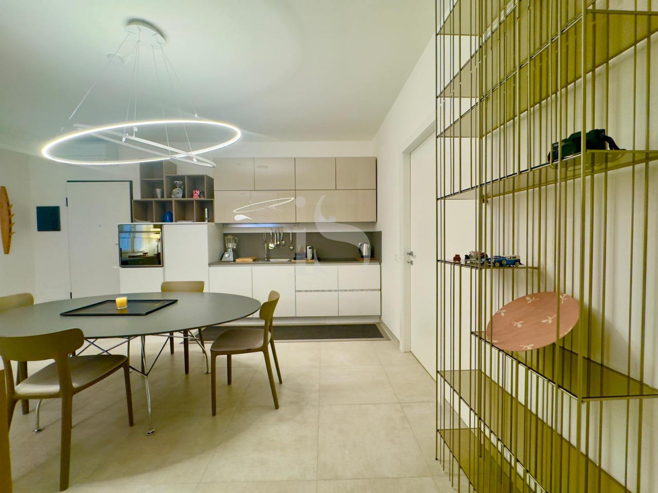 L'ingresso si apre su una zona giorno dove trova spazio una cucina realizzata su misura, completa di elettrodomestici e piano ad induzione, progettata per integrarsi in modo ordinato e coerente con l'ambiente.