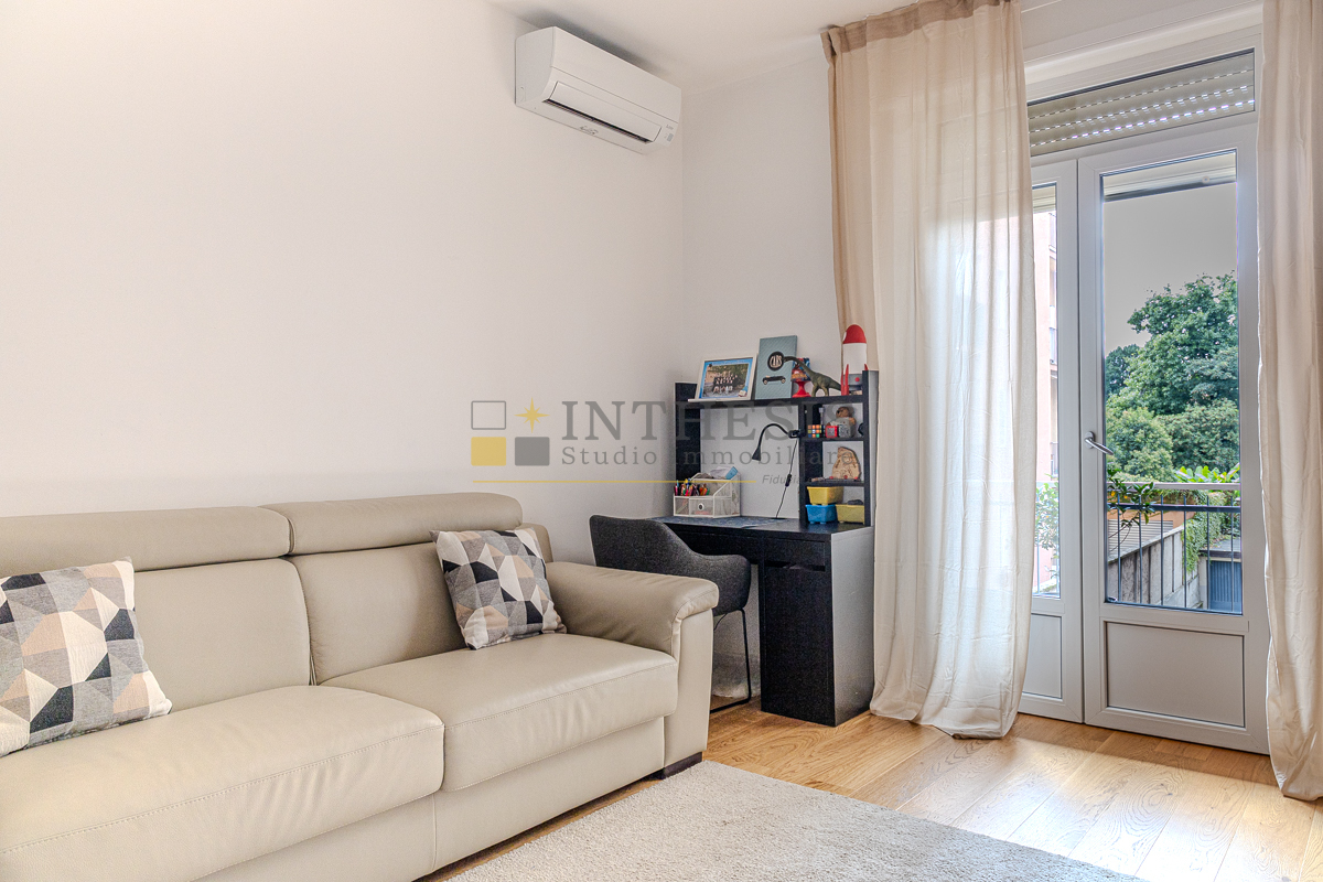 Ristrutturato recentemente, lappartamento ti accoglie con spazi ben distribuiti e rifiniture di qualità: ingresso su ampio soggiorno con balcone cucina abitabile separata camera matrimoniale con secondo balcone e piacevole affaccio sul verde bagno finestrato con box doccia in cristallo, pavimenti e rivestimenti in gres effetto marmo, sanitari sospesi Le finiture interne sono eleganti e moderne: parquet in rovere chiaro in tutta la casa, serramenti rinnovati, riscaldamento centralizzato con termovalvole e impianto di climatizzazione con pompa di calore caldo/freddo.