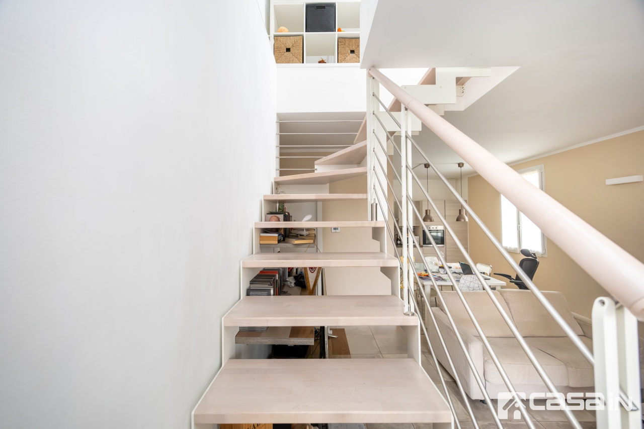L'immobile è composto da ingresso , ampio soggiorno con con sfogo sul terrazzino, cucina abitabile a vista e bagno con doccia al piano primo; ampia camera mansardata con travi a vista sbiancate al piano sottotetto.