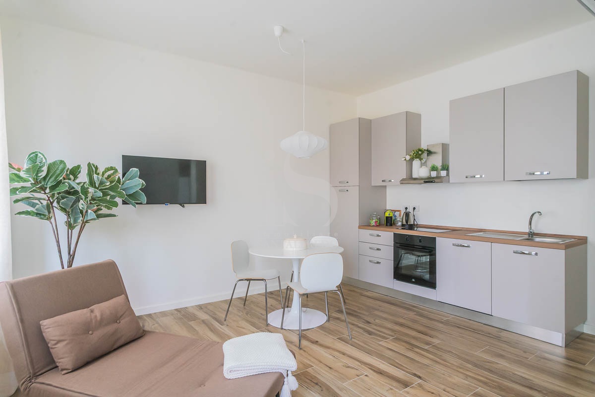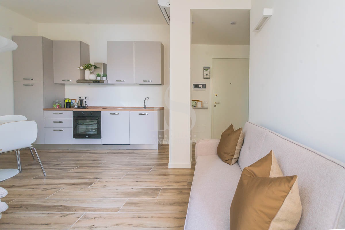 La cucina a vista, sviluppata su un'unica parete, è completa di elettrodomestici e dotata di piano cottura a induzione.