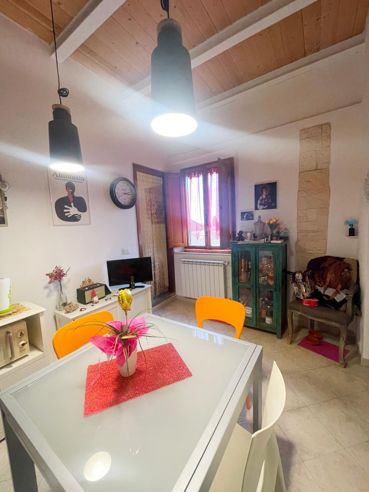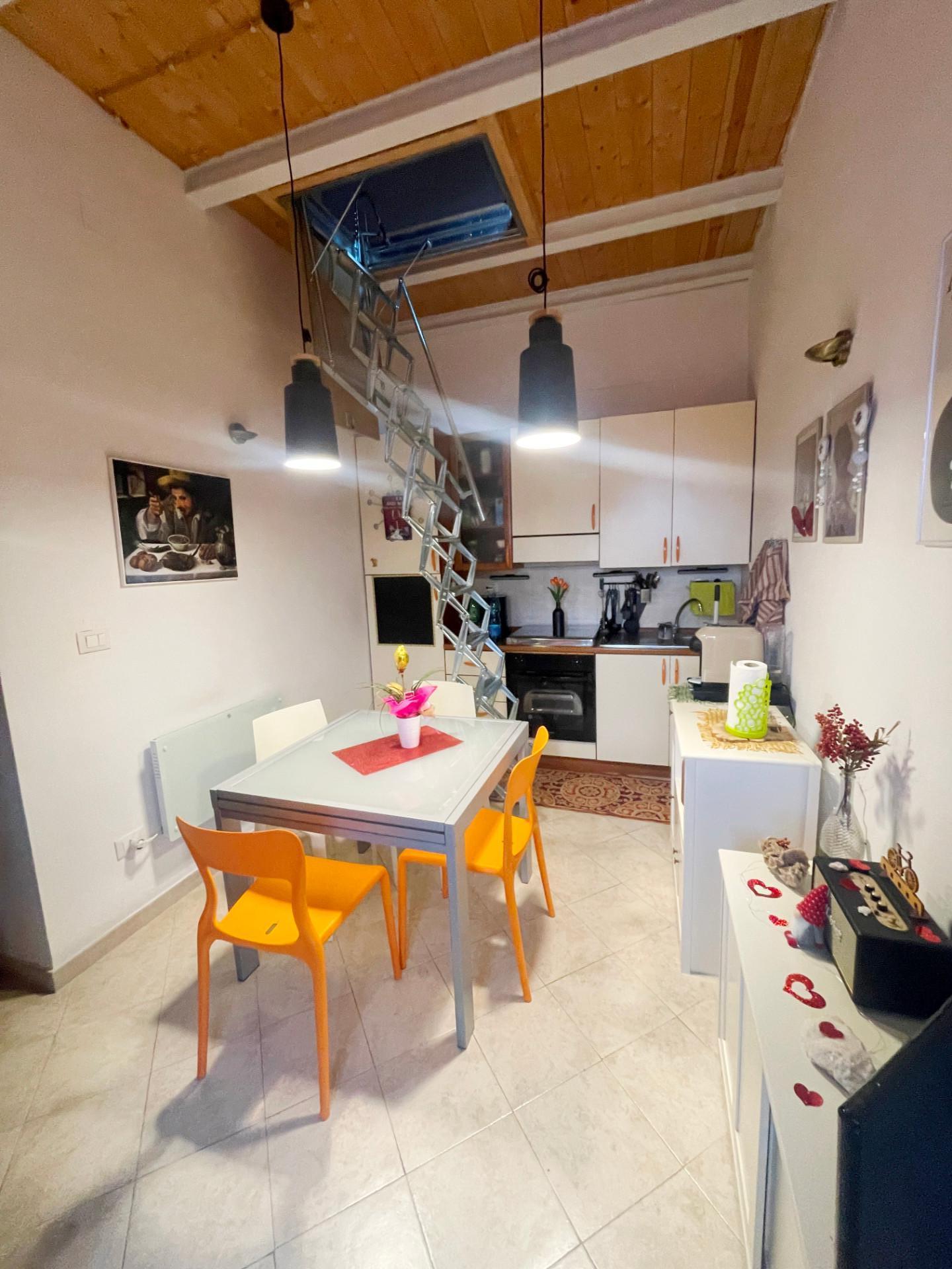 L'immobile è composto da cucina-pranzo, antibagno/ripostiglio, bagno con piccola finestra, camera; attraverso scala retrattile si accede alla soffitta pavimentata e dotata di due lucernari.