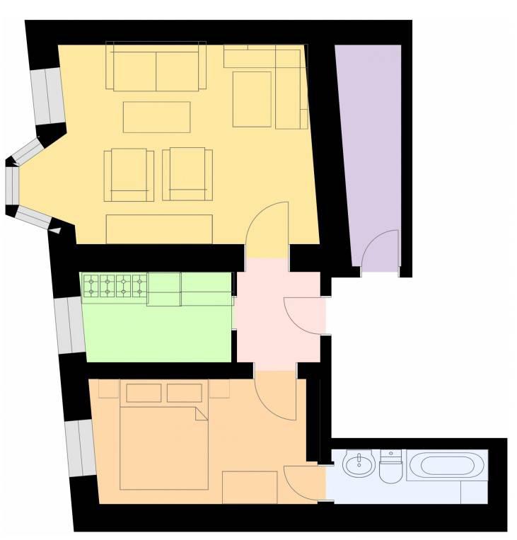 L'immobile composto da un ampio soggiorno, una cucina, una camera matrimoniale ed un bagno-WC. Un ripostiglio separato sullo stesso piano offre ulteriore spazio di archiviazione.