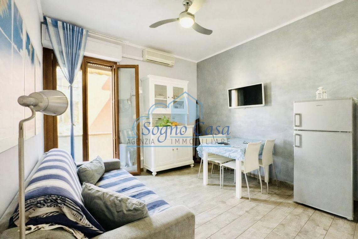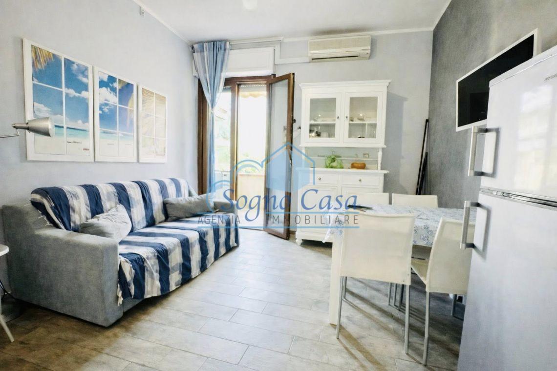 Limmobile si apre su un luminoso soggiorno con angolo cottura, dotato di divano letto e accesso diretto a un balcone con piacevole vista mare parziale.