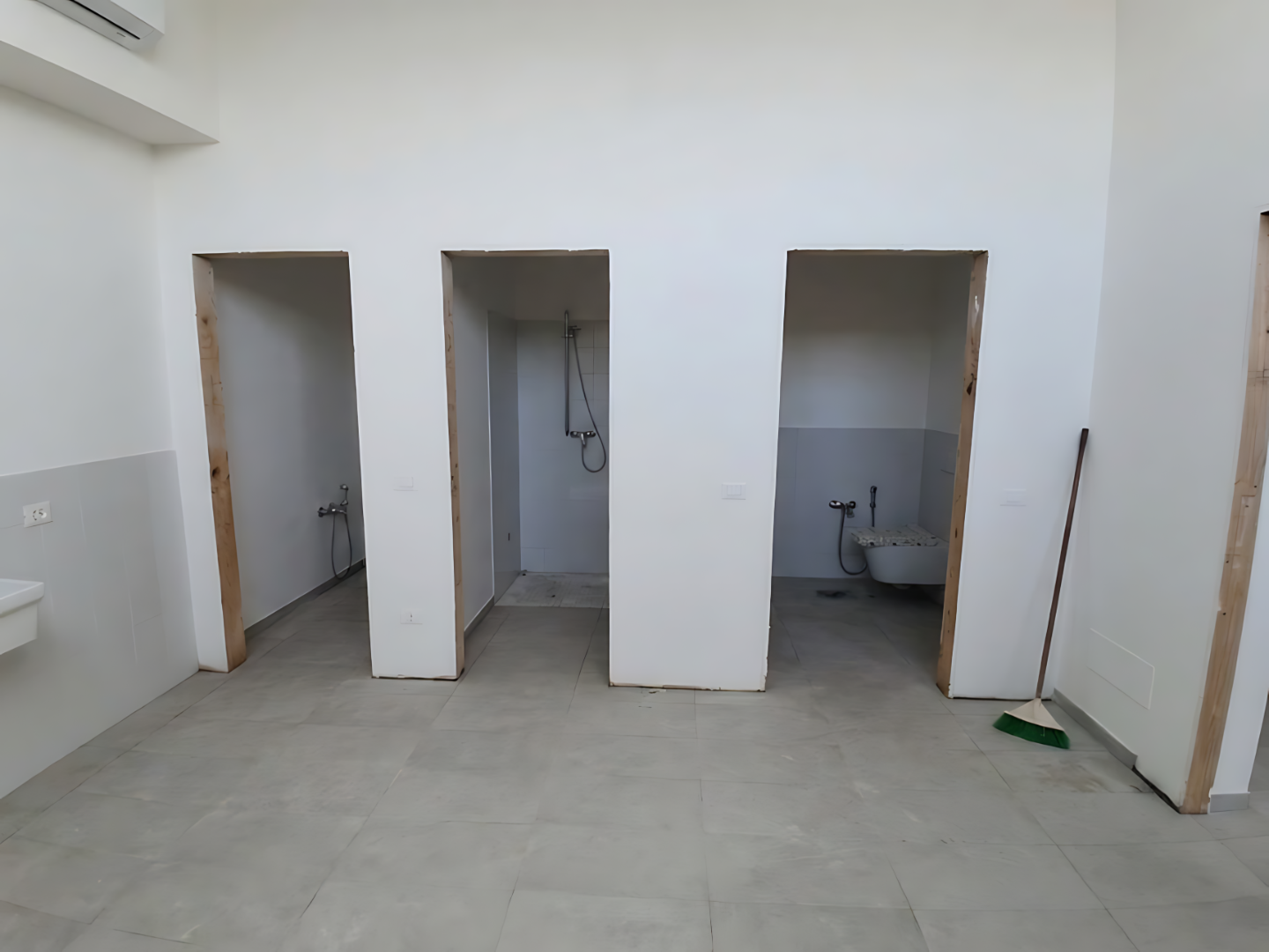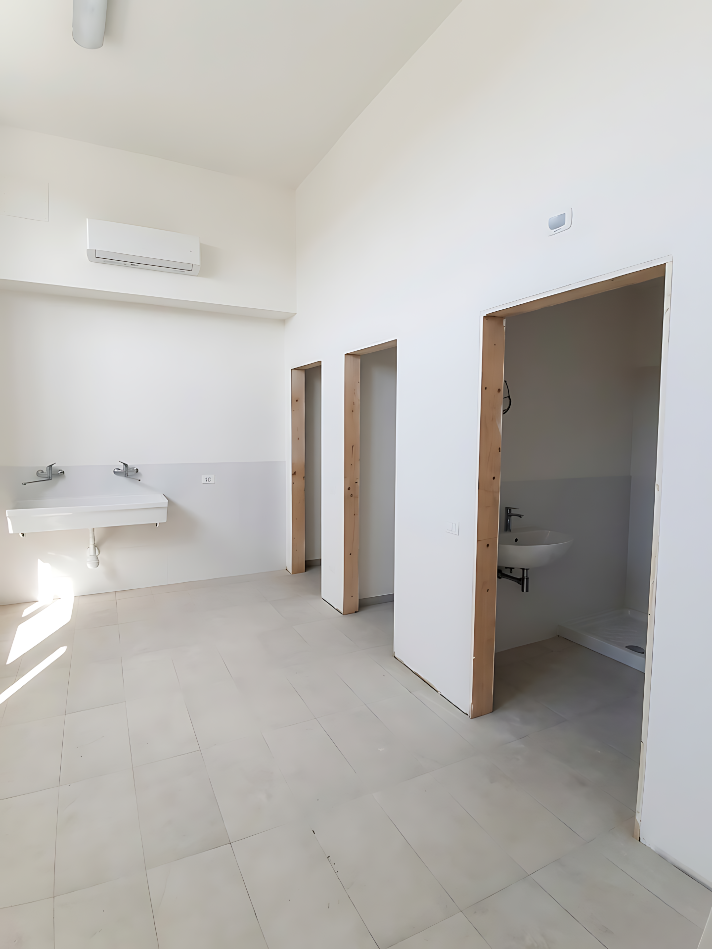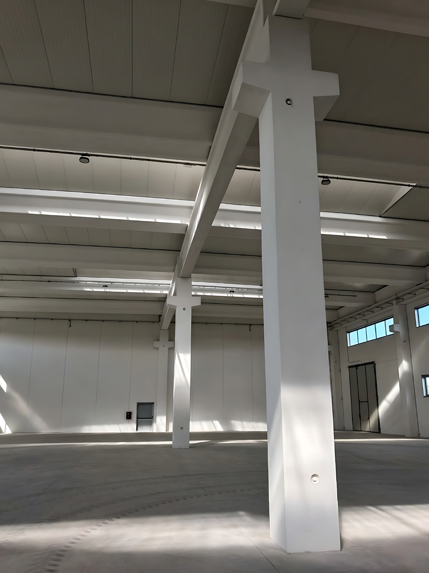 All'interno, la struttura è fornita di mensole per carroponti con capacità di 10 tonnellate e due spogliatoi, ognuno dotato di quattro WC e due docce.