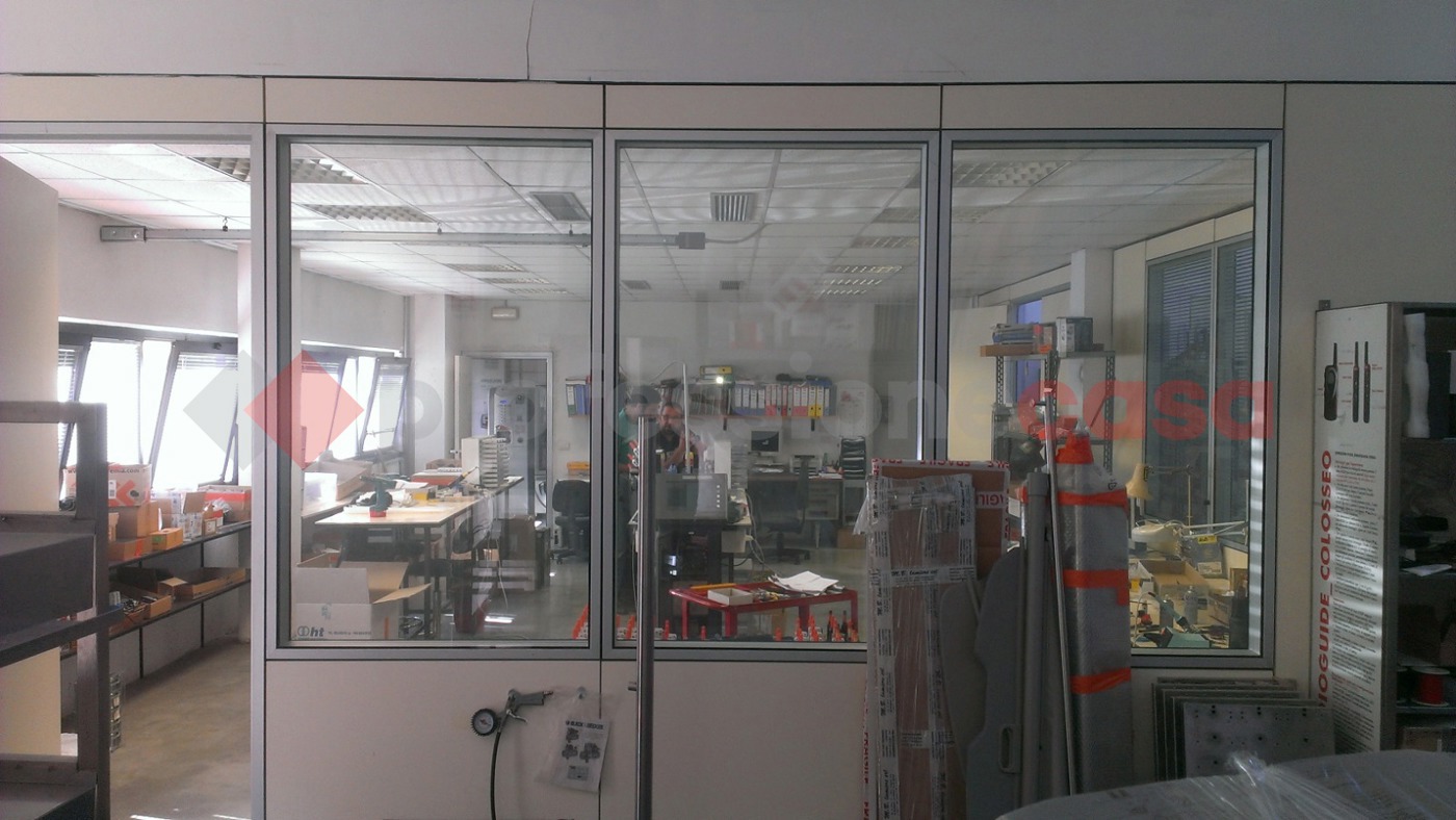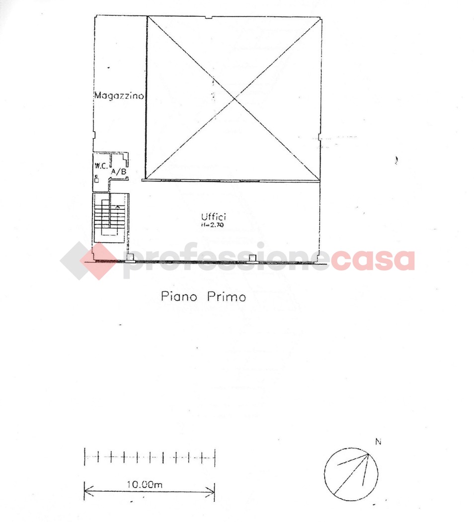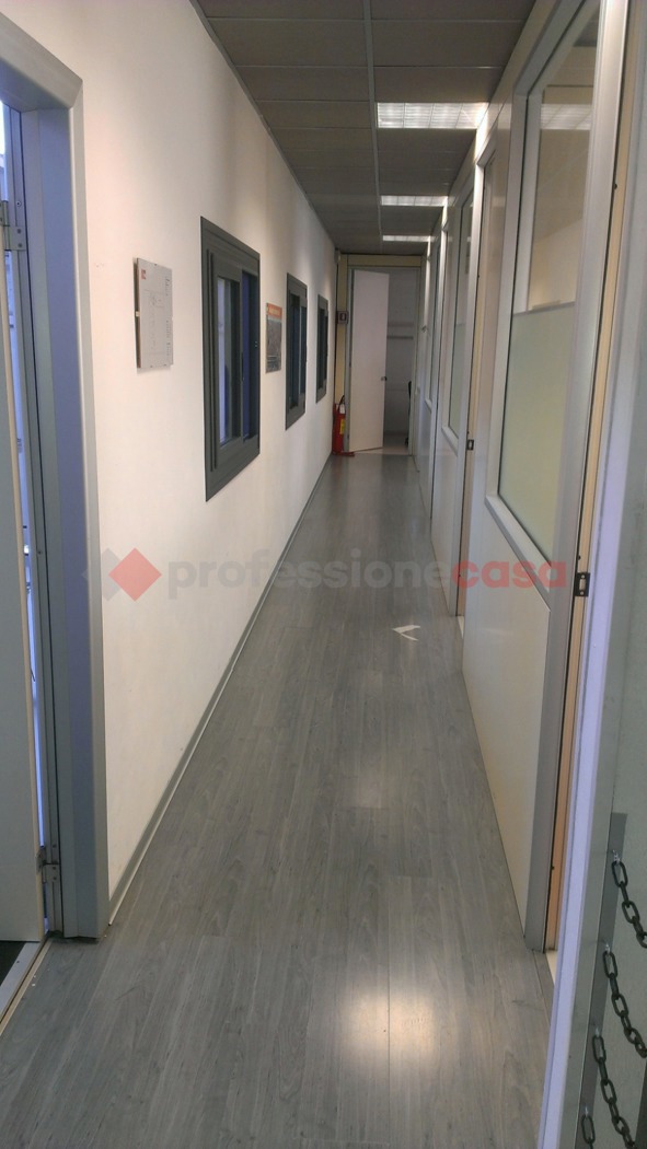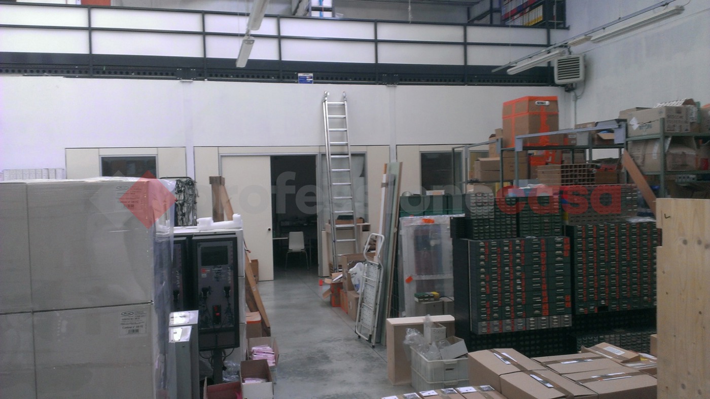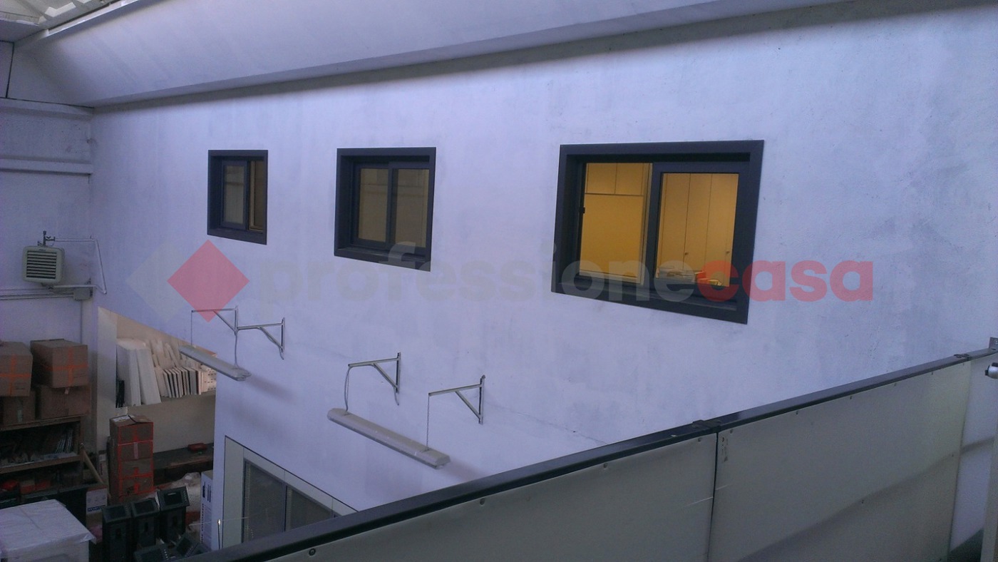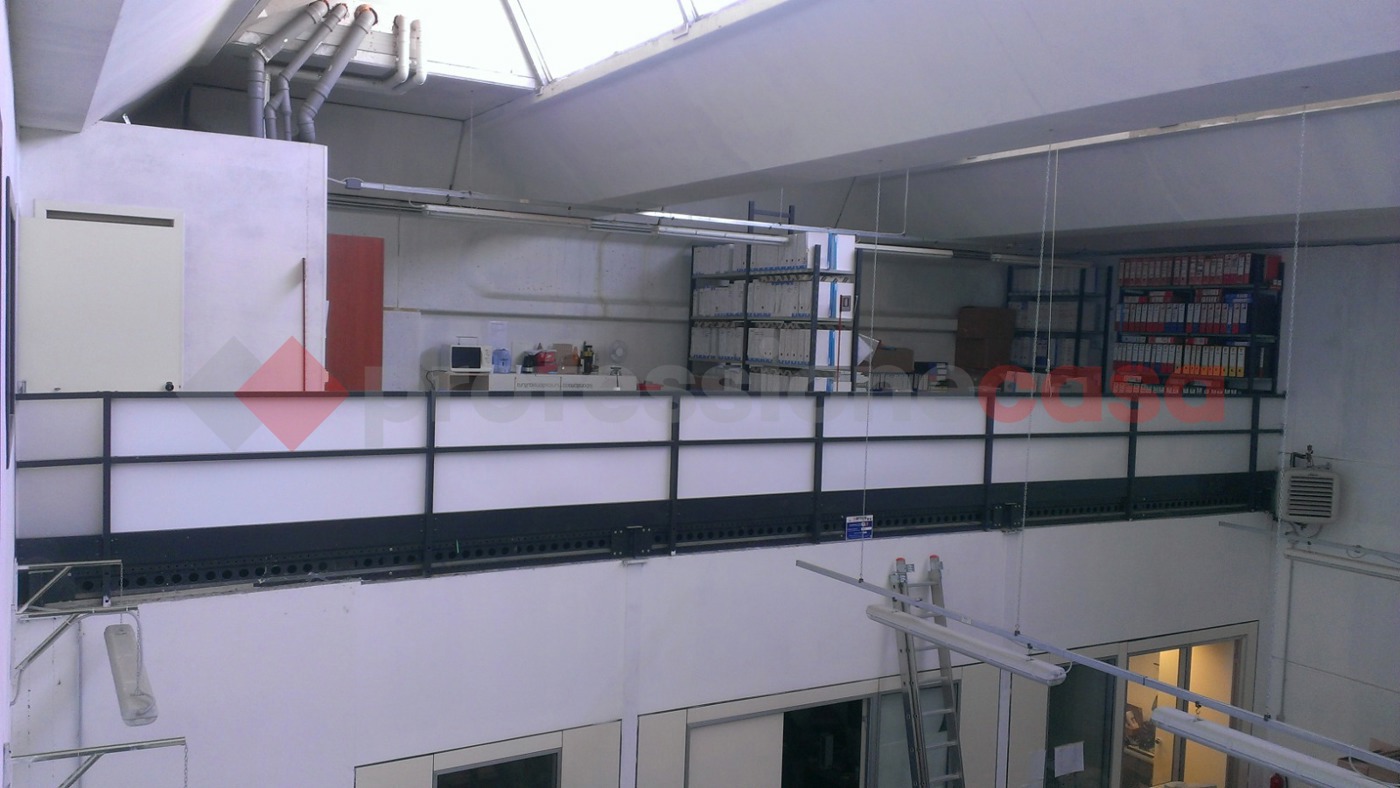 Una scala interna collega il piano terra al soppalco, che offre ulteriori 112 mq di spazio per uffici con altro bagno.