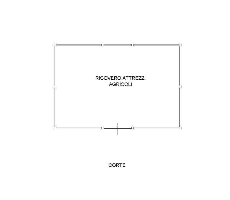 Capannone agricolo con corte in ghiaia in struttura di c.a. prefabbricato, di forma rettangolare compatta a cui si accede mediante ampio varco con portone metallico scorrevole; sul lato nord sono stati edificati due silos ad uso stivaggio granaglie o altri materiali agricoli; circondato da cortile in ghiaia ed erba spontanea composto, sebbene questultima sia accatastata come terreno agricolo seminativo.