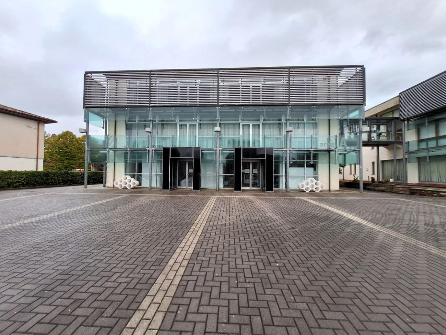 Al primo piano è presente un corridoio pensile in vetro e acciaio di collegamento al fabbricato.