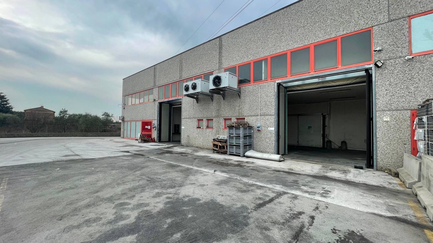 L'immobile ha 3 portoni d'ingresso ed internamente è completamente refrigerato con poste scorrevoli automatiche e celle frigo chiuse con altezza interna di 4 mt. Esternamente corredato da piazzale privato di 250 mq oltre ad altro piazzale condominiale completamente recintato.