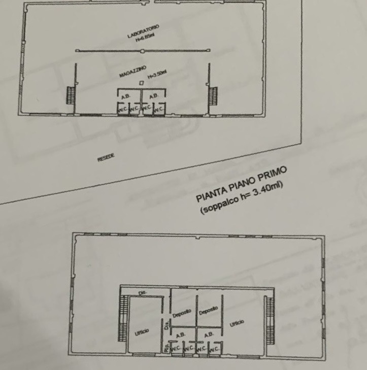 Tramite due rampe di scale si accede al piano primo, composto da ampie stanze per uffici, vani deposito, disimpegni, antibagni e altri quattro bagni.