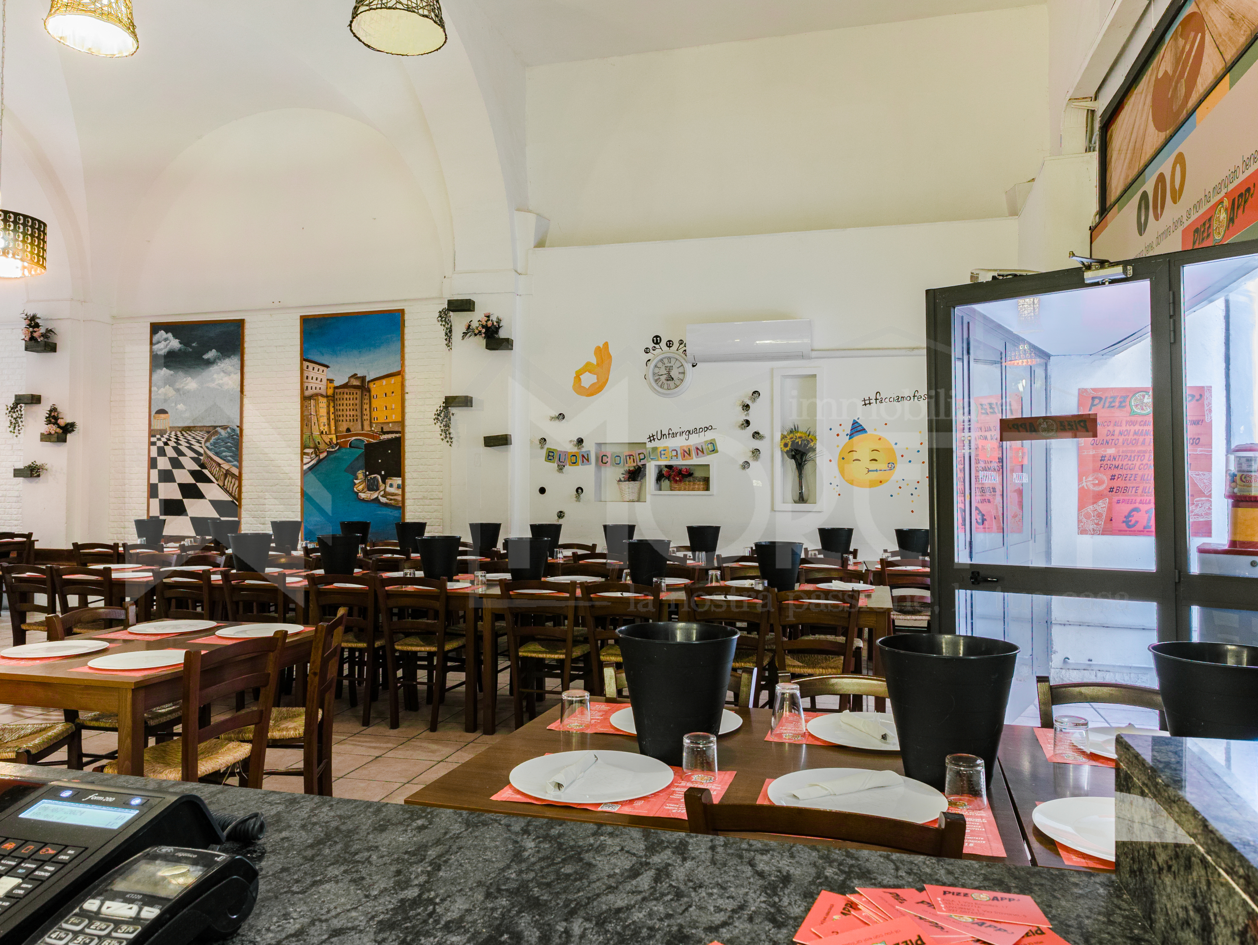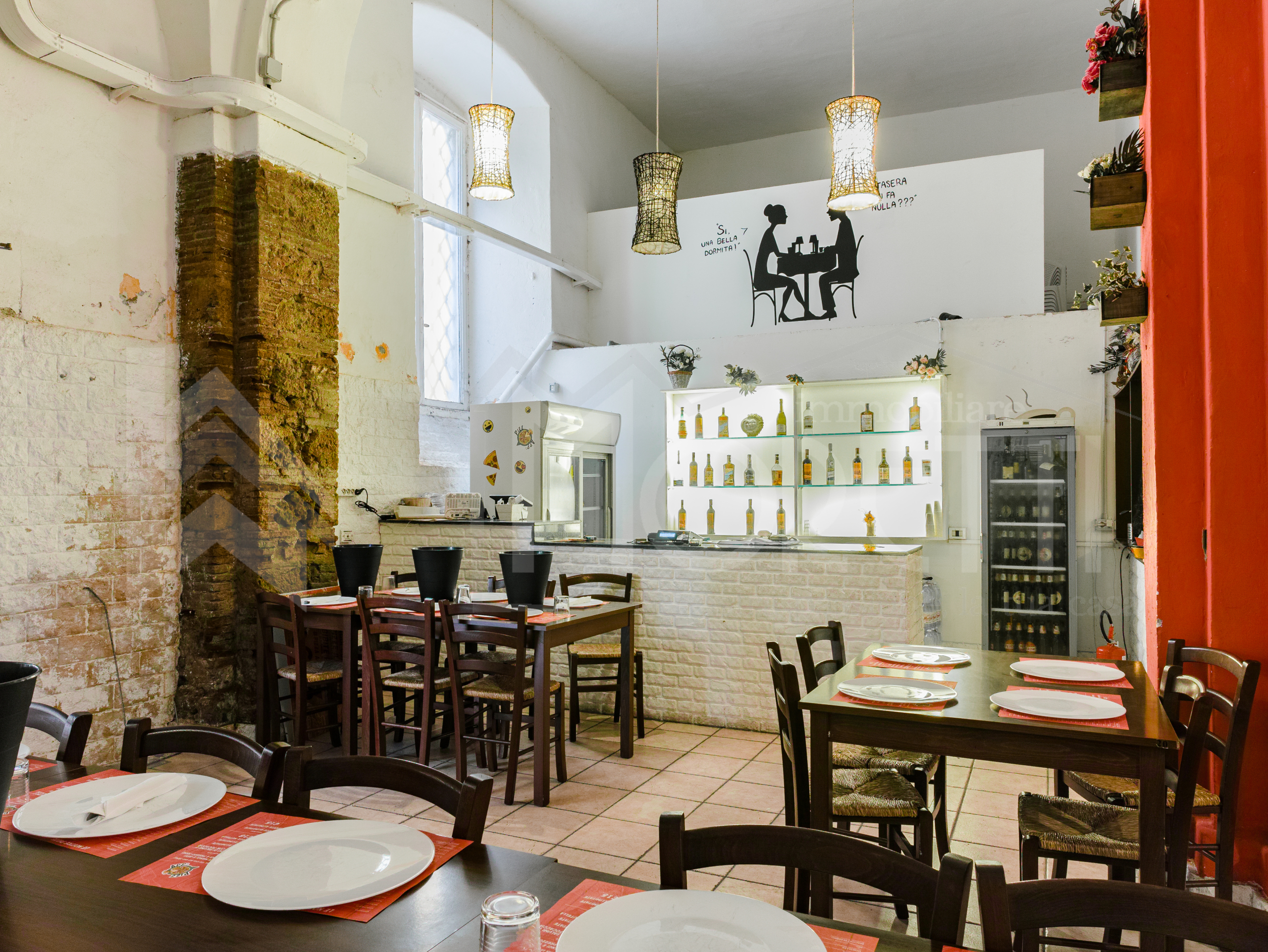 Dallingresso si accede alla prima grande sala atta alla ristorazione che ha una superficie di ca. 150 mq, attrezzata con angolo bar, da cui si accede ad un ulteriore sala di ca. 38 mq. Lampia cucina che ha una superficie utile di ca. 65 mq, dotata di due importanti finestre ed equipaggiata di canna fumaria, ha accesso ai due comodi magazzini, uno di 11 mq di superficie e laltro di 8 mq. Limmobile si completa di uno spogliatoio e di un bagno per il personale, di altri due bagni per la clientela, di cui uno a norma per i disabili, oltre che di un ulteriore piccolo ripostiglio.