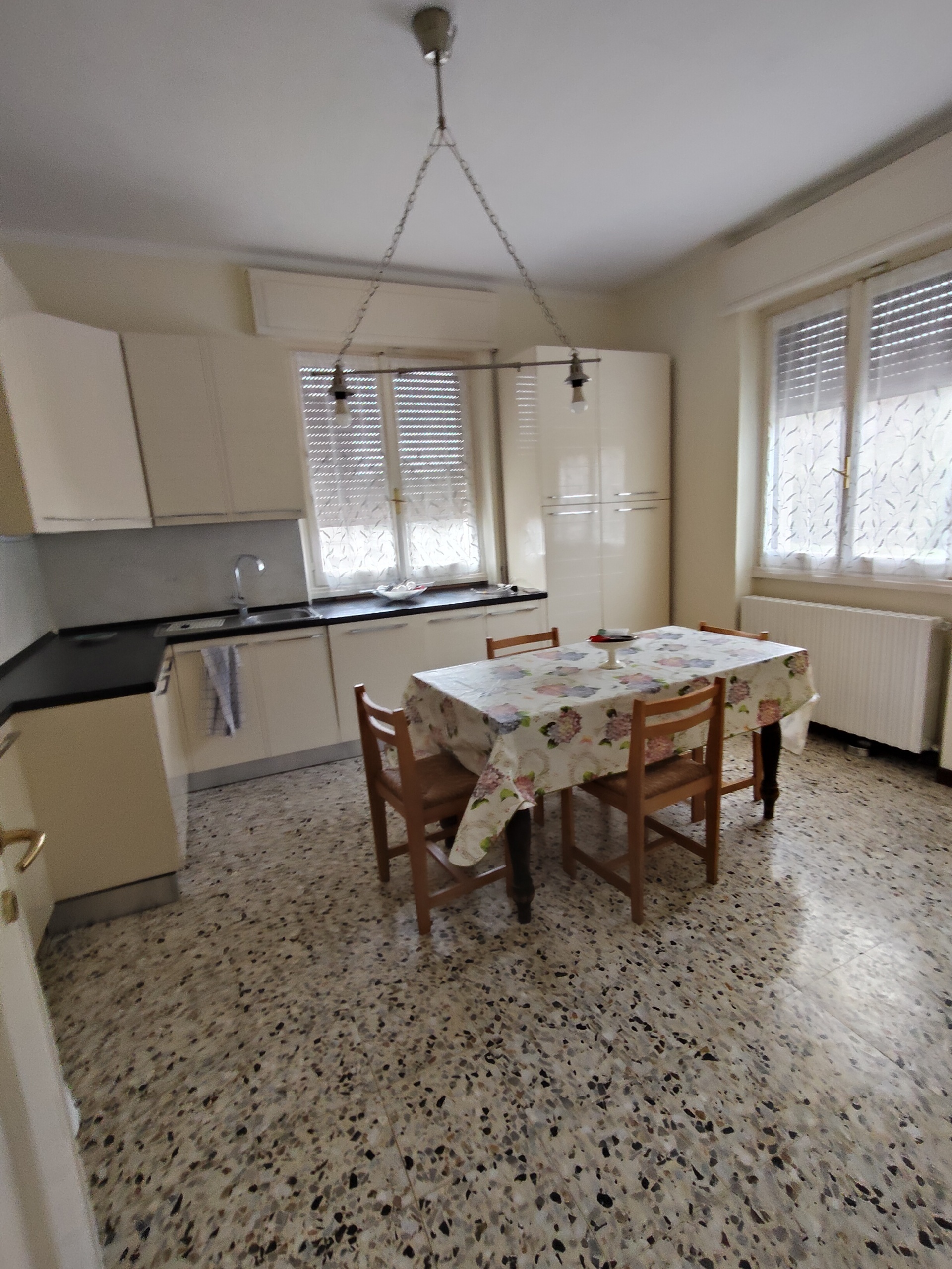 La zona giorno si apre con una cucina abitabile di grandi dimensioni, uno spazio ricco di luce naturale che invita a vivere la convivialità, a condividere pranzi in famiglia o semplici momenti di relax.