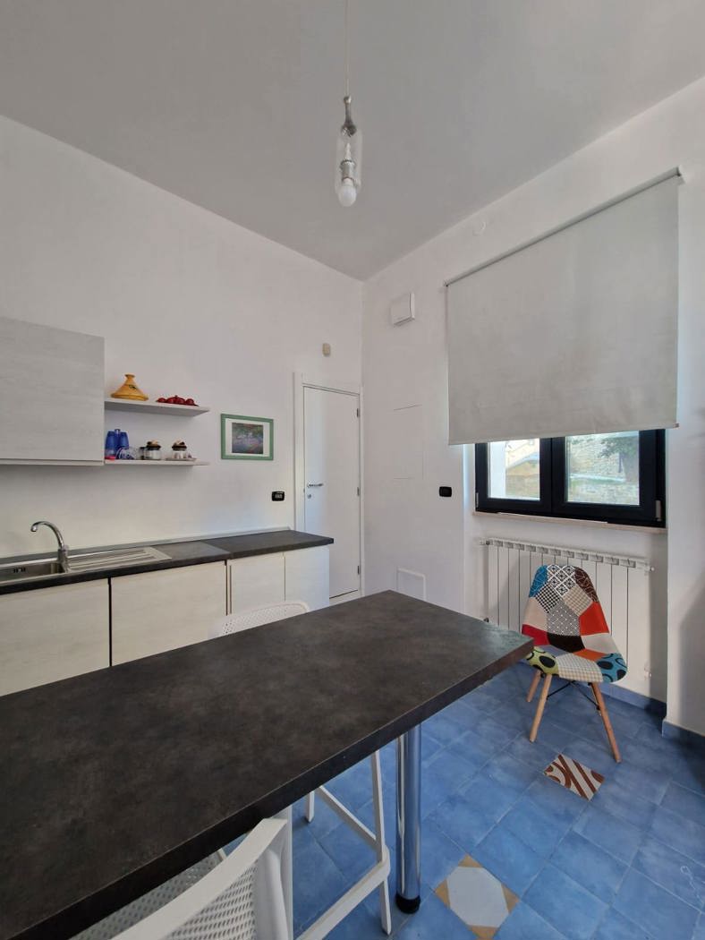 Lingresso si apre su un open space che integra salone e cucina, arredata con tutti gli elettrodomestici necessari: lavastoviglie, forno, microonde, macchina del caff e lavatrice.