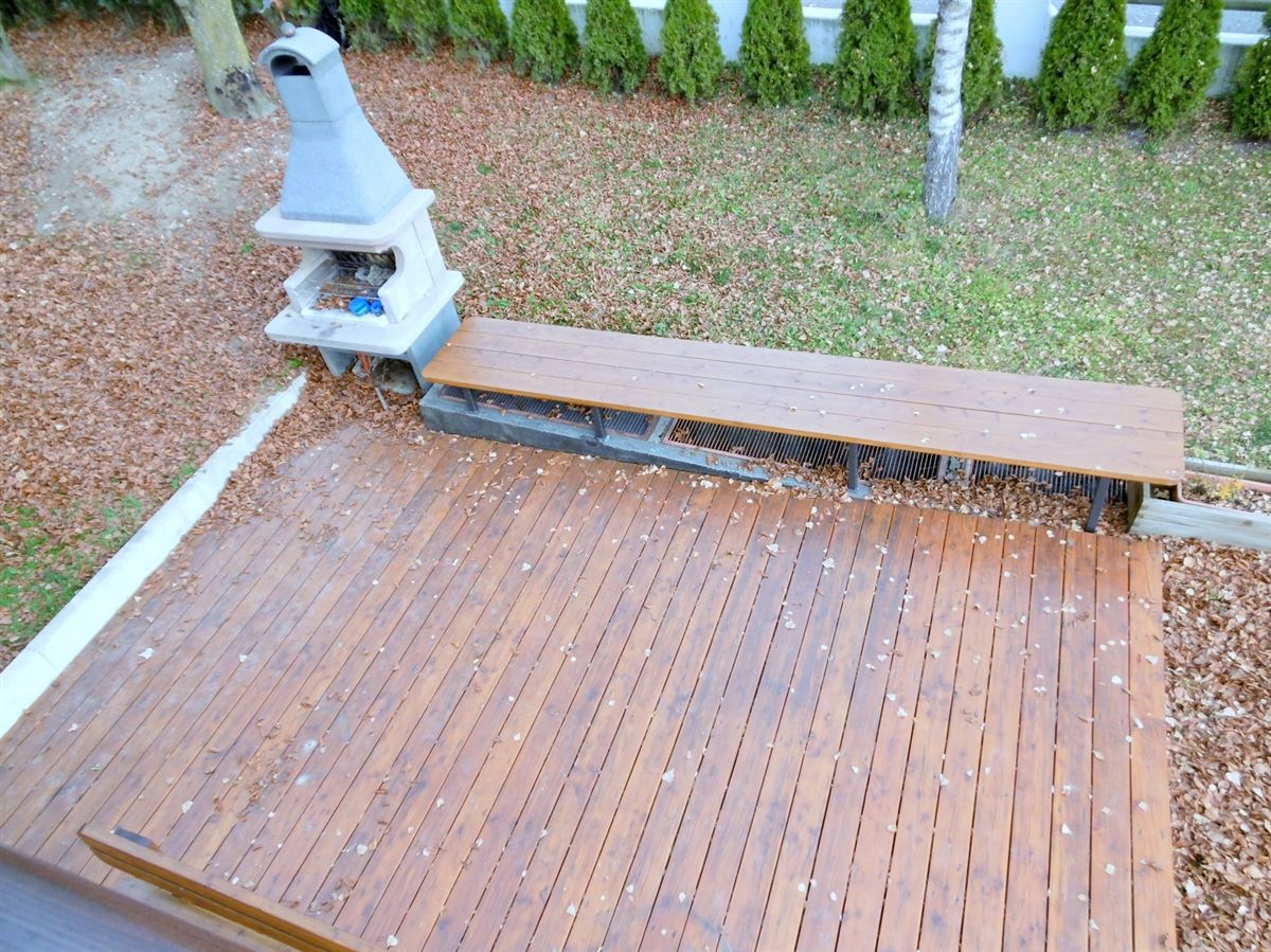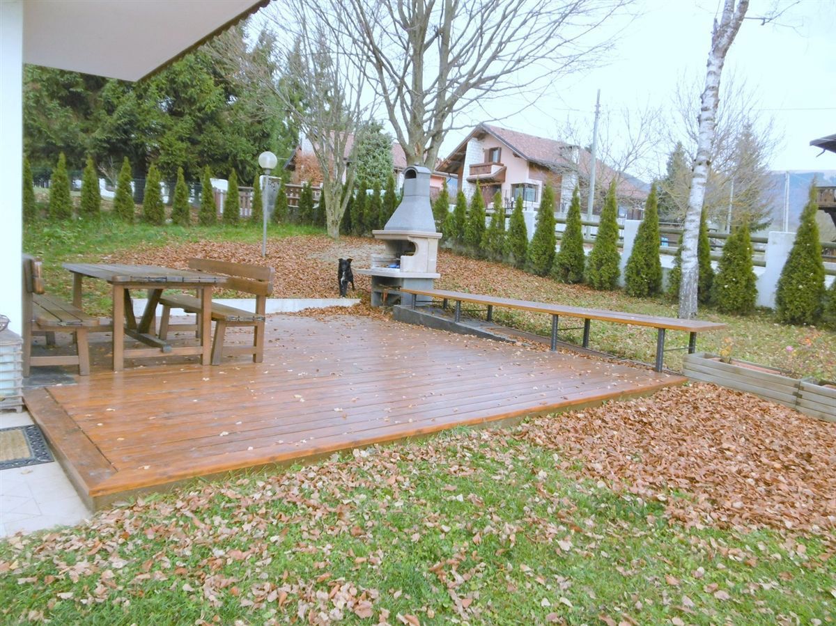 Al piano terra salone doppio con camino, cucina e accesso diretto al giardino con terrazza in legno e zona barbeque.