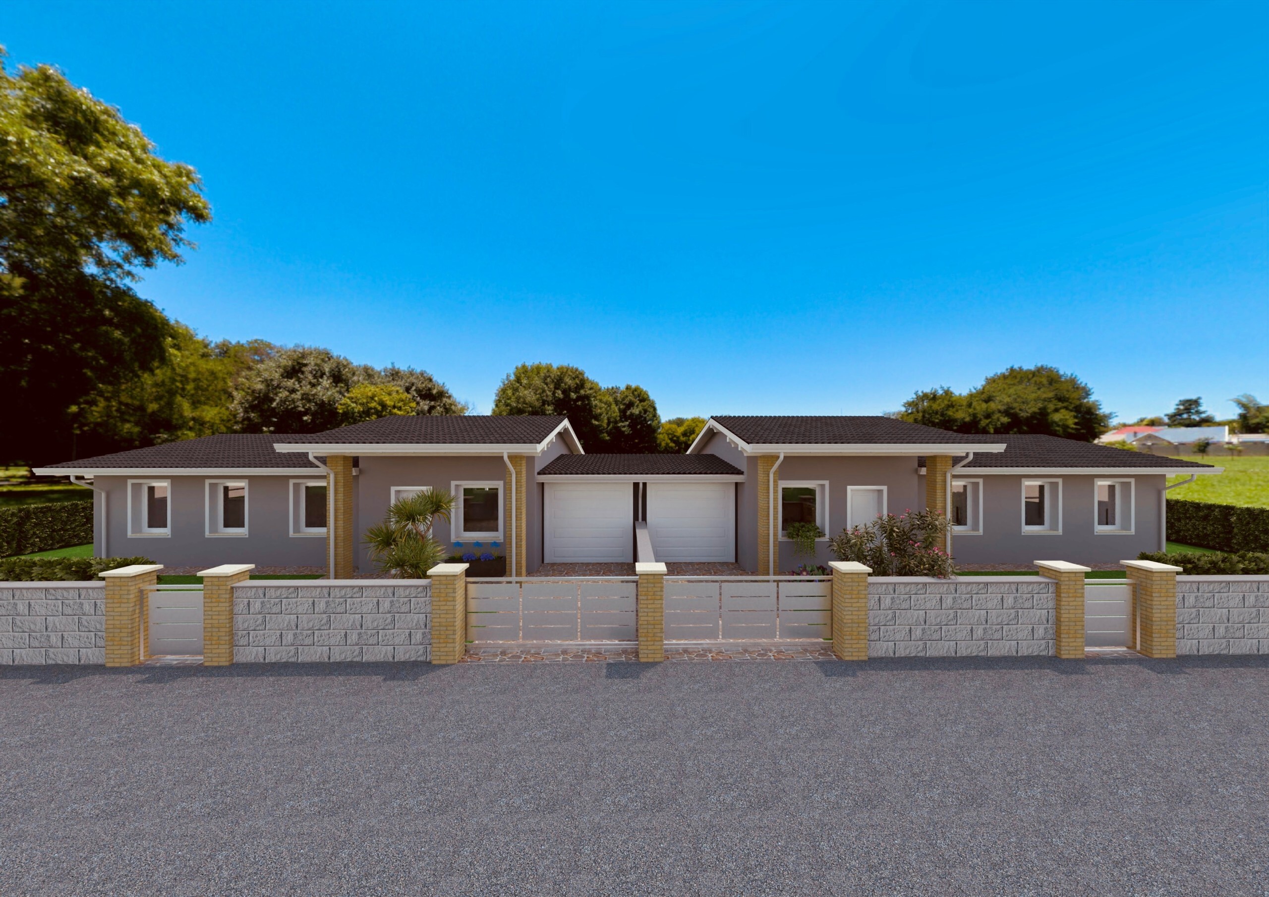 ville in bifamiliare di prossima realizzazione tutte al piano terra composte da garage grande, due bagni, soggiorno e cucina, disimpegno, tre letto, giardino laterale.