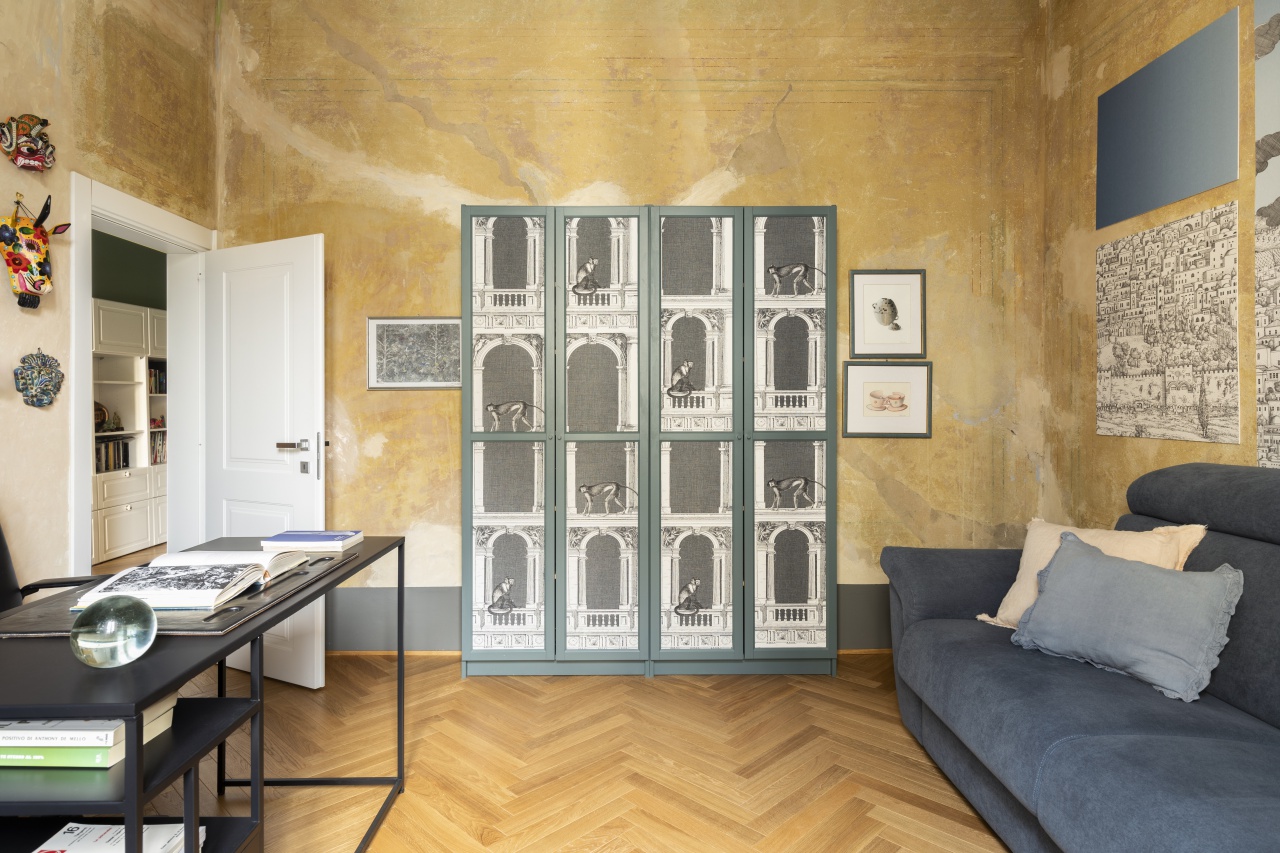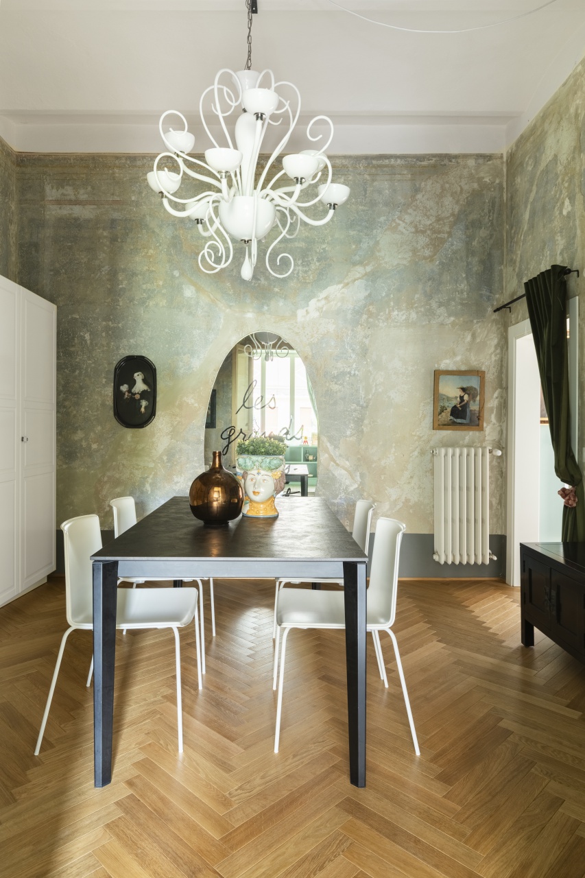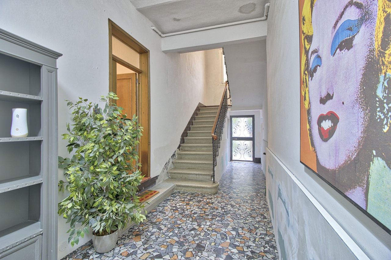Primo piano: MQ.108 Ingresso ampio , sala pranzo , salone tv e lettura con pavimento originale in graniglia e una grande finestra incorniciata da libreria su misura.