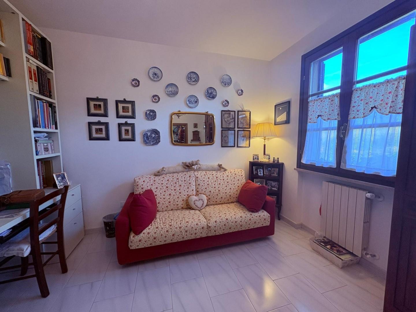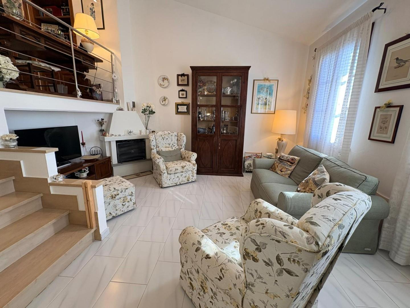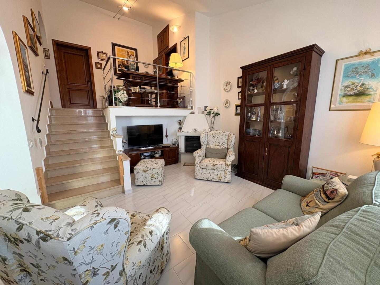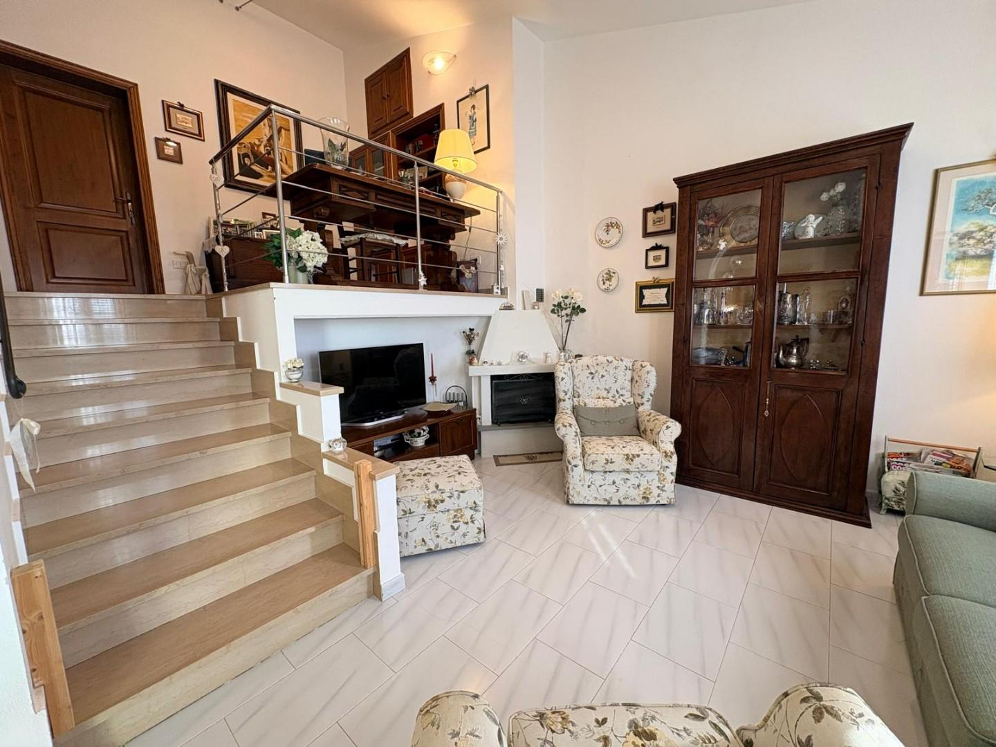 Da qui si accede a un magnifico salotto con camino, cuore caldo della casa, ideale per momenti di relax e convivialità. La zona notte ospita una camera matrimoniale, una camerina e un servizio, offrendo spazi ben distribuiti e funzionali.