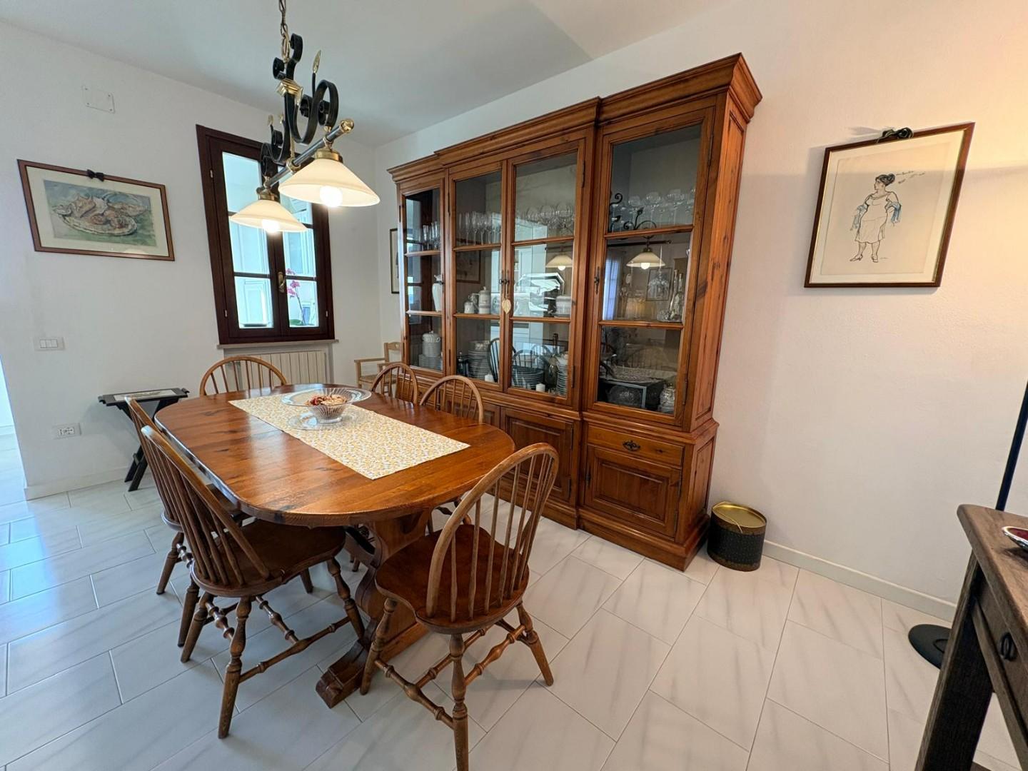 Salendo pochi gradini si raggiunge una ampia zona pranzo con angolo cottura, inserita in una luminosa veranda, regolarmente dichiarata, che regala luce e continuità agli ambienti.