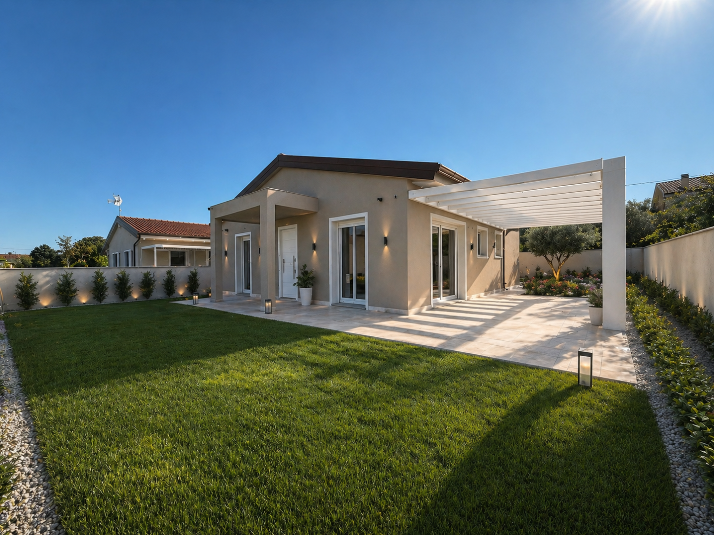 Giardino che circonda la casa su quattro lati e sul quale insiste un pergolato che volendo può divenire una bellissima zona giorno estiva chiusa a vetri e un bel loggiato dingresso.