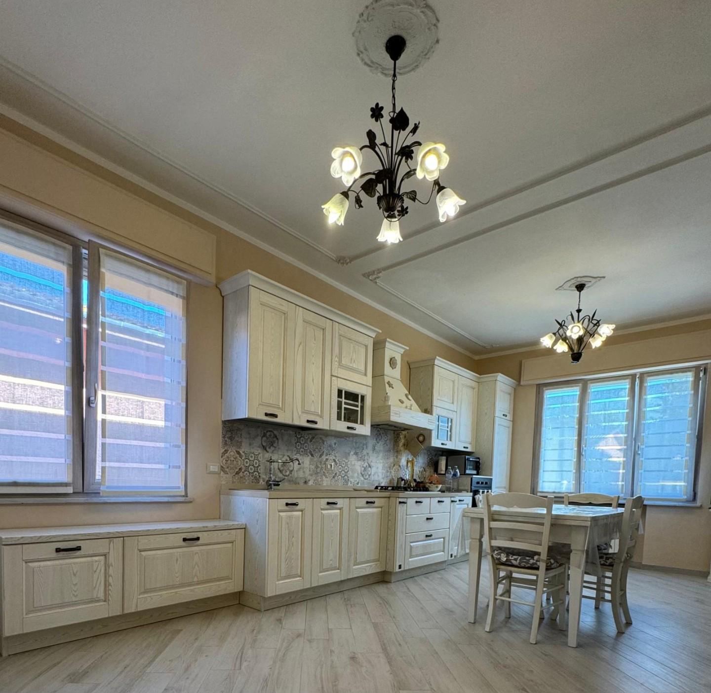 Lingresso si apre su un ampio e luminoso salone, arricchito da doppio accesso alla spaziosa cucina abitabile.