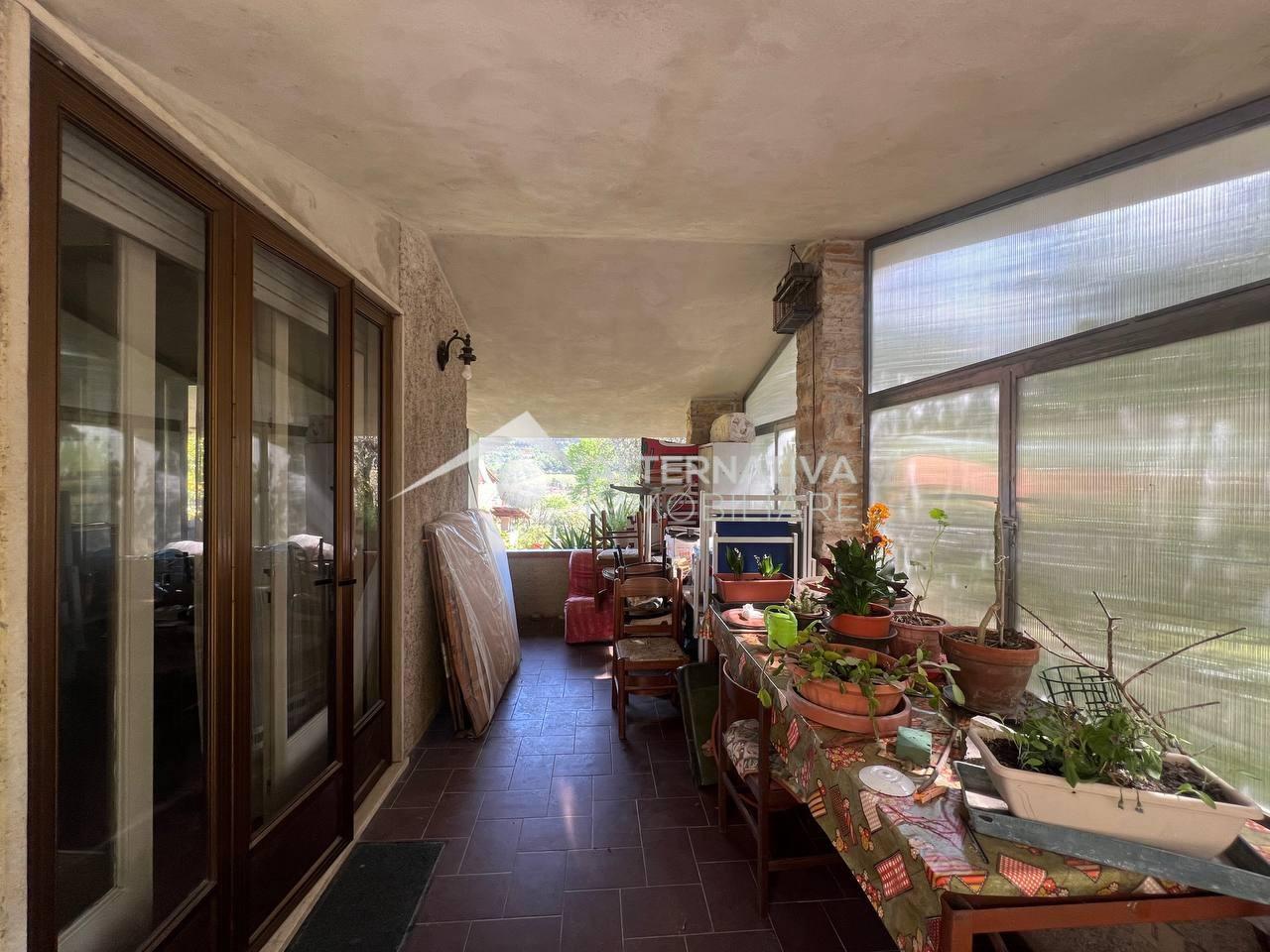Da una spaziosa veranda, la quale regala una vista magnifica sul paesaggio, si accede alla proprietà, così suddivisa: soggiorno, cucina abitabile, tre camere di cui due matrimoniali, bagno e vano ripostiglio.