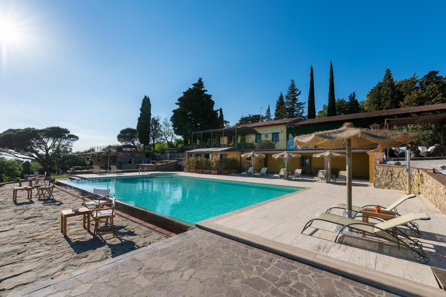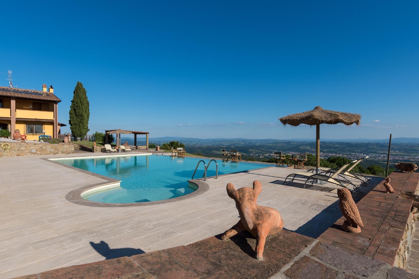Questo vero e proprio parco è impreziosito da: La suggestiva piscina a sfioro, di 112 mq, con idromassaggio e grande solarium in marmo travertino - Recinzione - Sistema di illuminazione esterno - Terrazze panoramiche IL CONTESTO: La villa si trova a Castra, nel comune di Capraia e Limite.