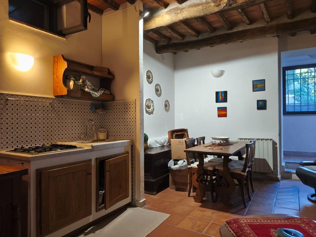 Il piano sottostante finestrato invece è adibito ad ulteriore zona giorno con soggiorno con camino e cucina e vano uso studio di ingresso oltre al bagno privato e l' accesso diretto al giardino esterno.