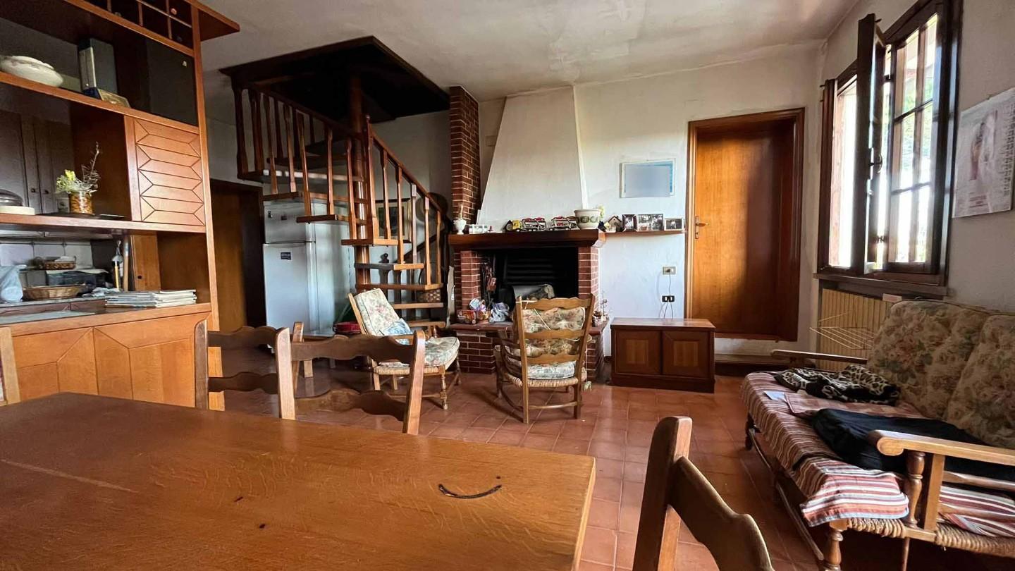 L'appartamento che fa parte di un blocco di sole 3 famiglie è dotata di ingresso indipendente da giardino privato ( ad oggi non recintato) dove è possibile parcheggiare al suo interno l'auto. La scala esterna ci accompagna al piano primo dove si sviluppa l'abitazione e dove un comodo balcone ci conduce all'ingresso di casa. Varcata la porta troviamo un soggiorno con angolo cottura dal taglio moderno dove fa da cornice un camino.