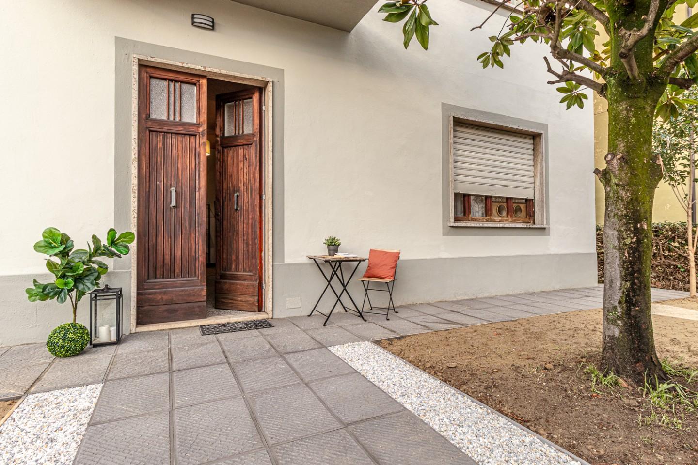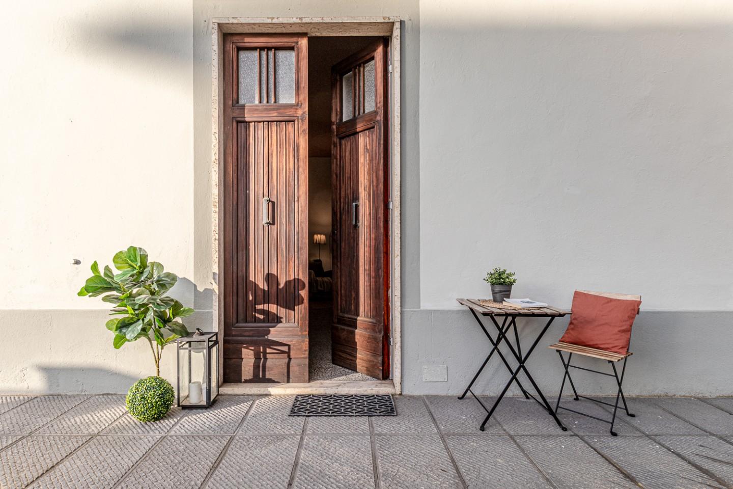 Dalla strada accedi tramite cancellino a una porzione privata con spazio esterno, poi varchi il grande portone dingresso e ti trovi in un androne ampio e ordinato.
