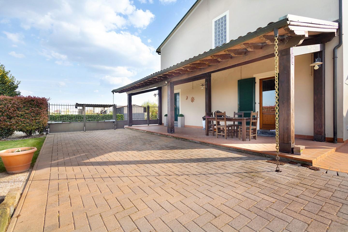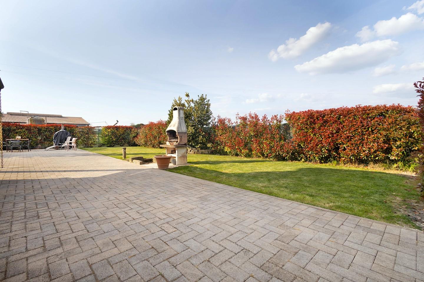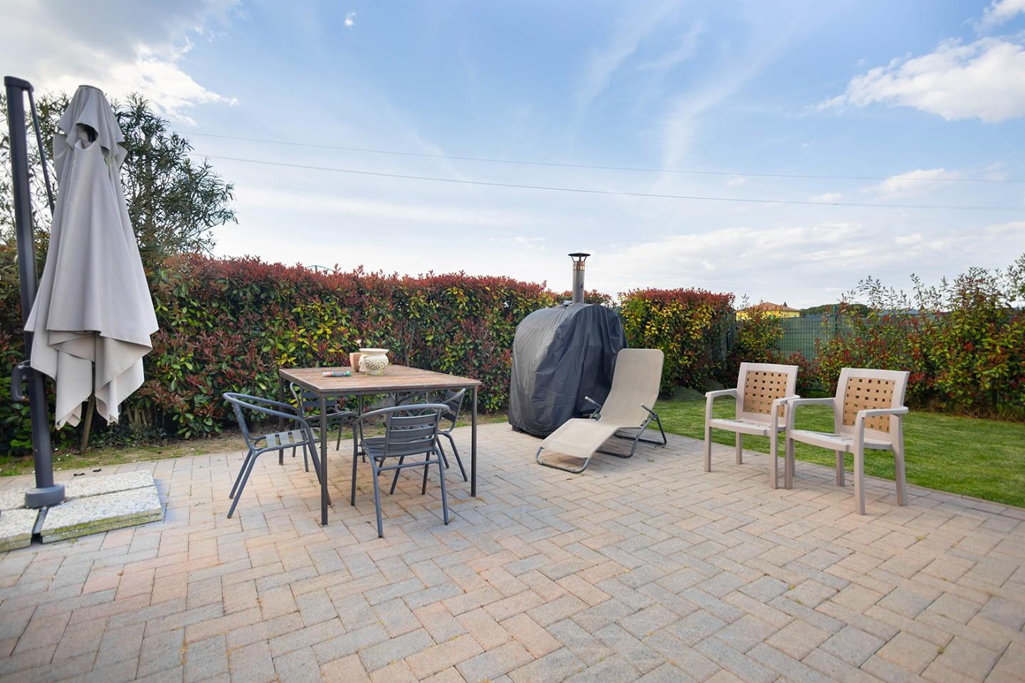 grande porzione di giardino su tre lati della villetta completamente recintato e curato con porticato, barbecue ideale per vivere con tranquillita' e relax lo spazio esterno nelle calde giornate estive o al primo sole primaverile.