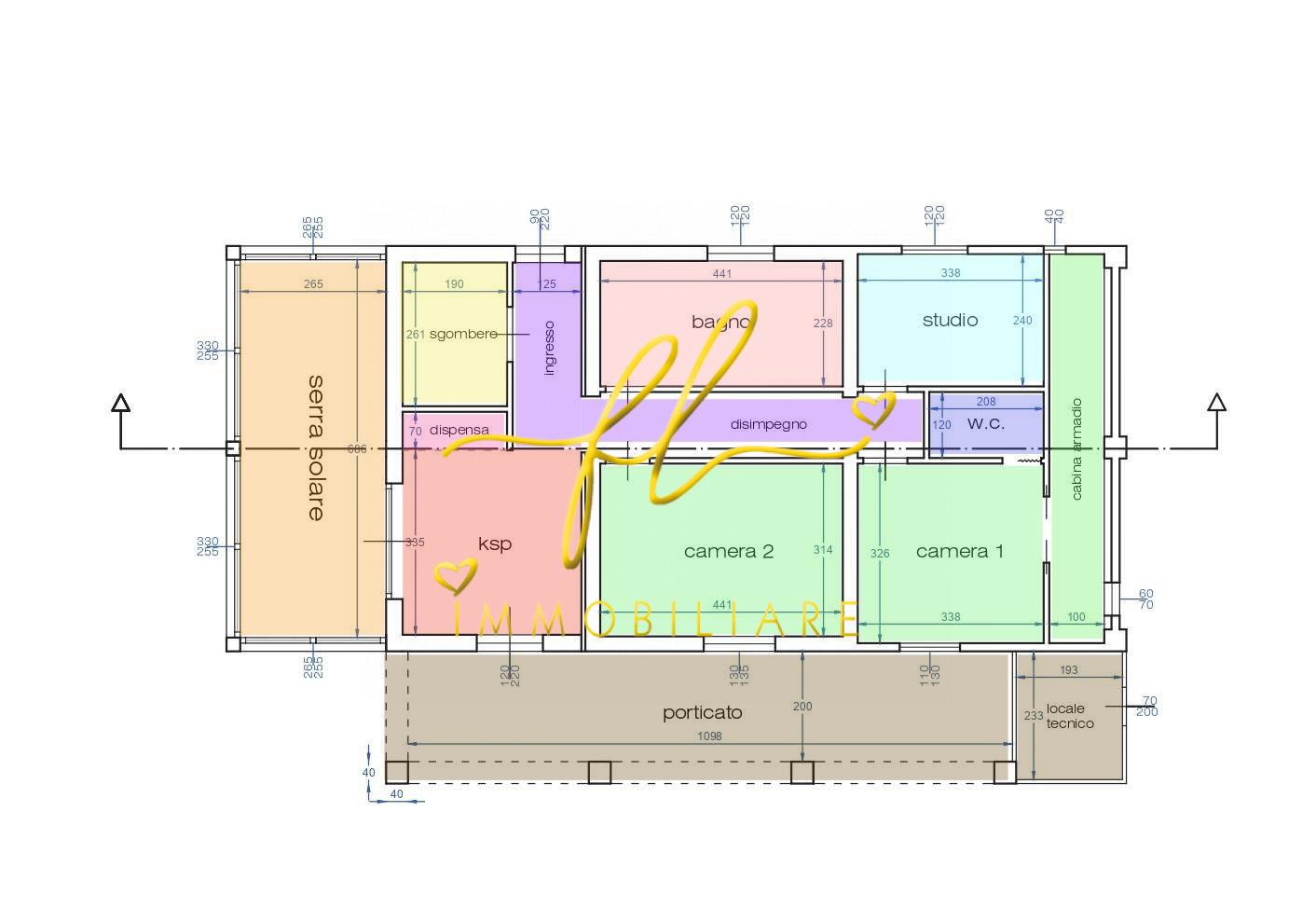 La soluzione progettuale attuale comprenderebbe soggiorno/cucina con dispensa e serra solare, disimpegno, camera matrimoniale con cabina armadi, camerina, studio, doppi servizi, locale di sgombero e locale tecnico.
