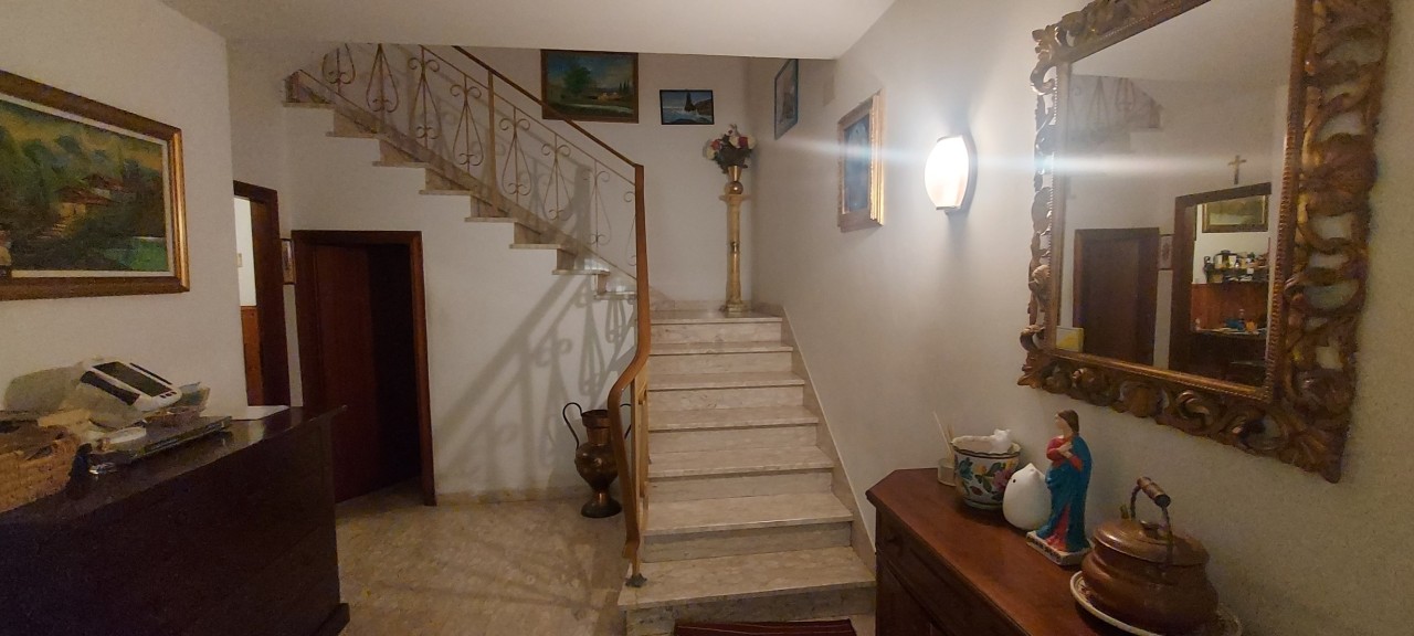 Attraversando il grande loggiato esterno di proprietà esclusiva si giunge all'ingresso principale, che si apre su un ampio disimpegno che ospita la scala che conduce all'unità abitativa vera e propria.