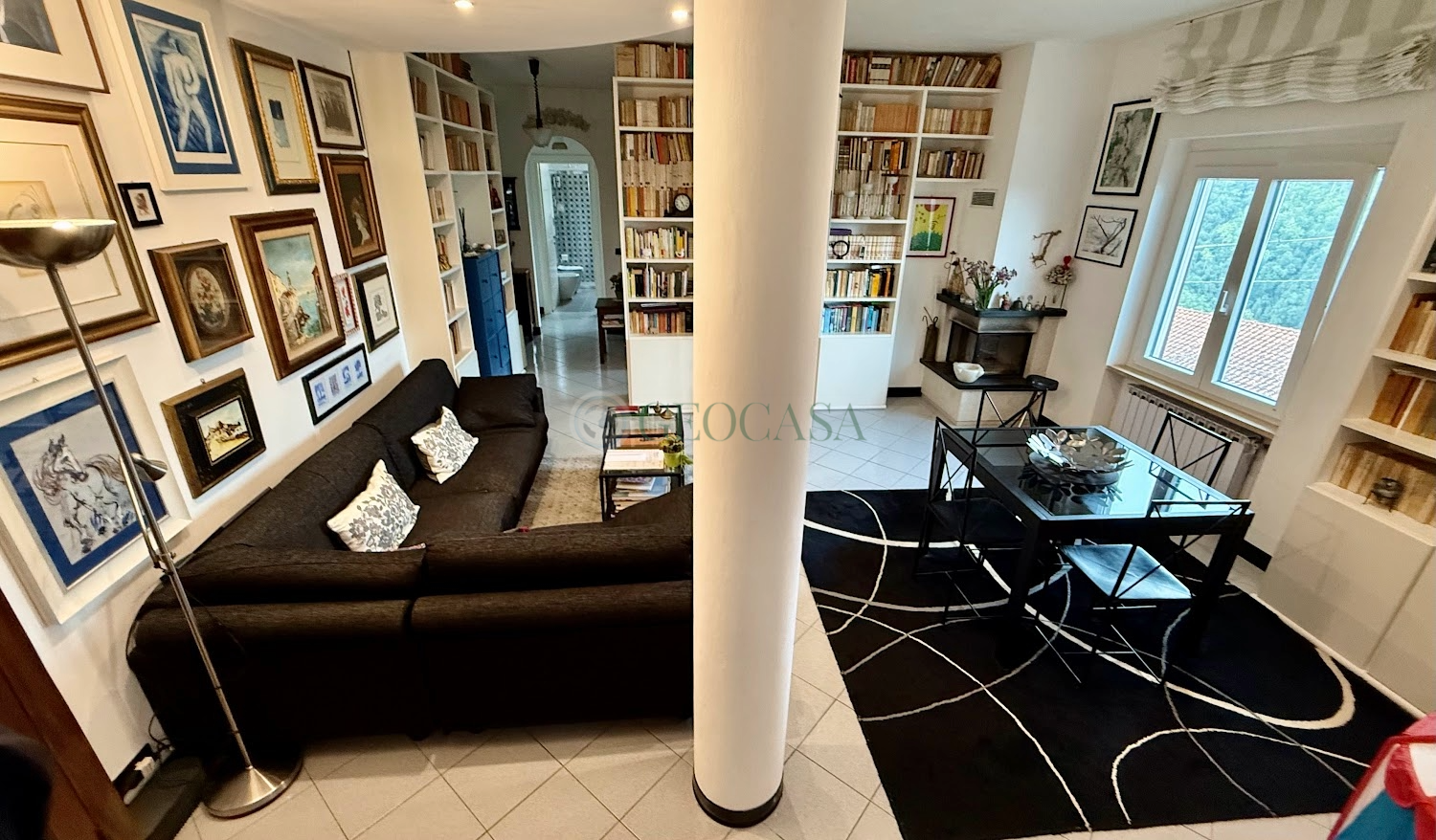 Si entra in un accogliente e luminoso soggiorno, impreziosito da due finestre e da un camino, perfetto per stare in famiglia.
