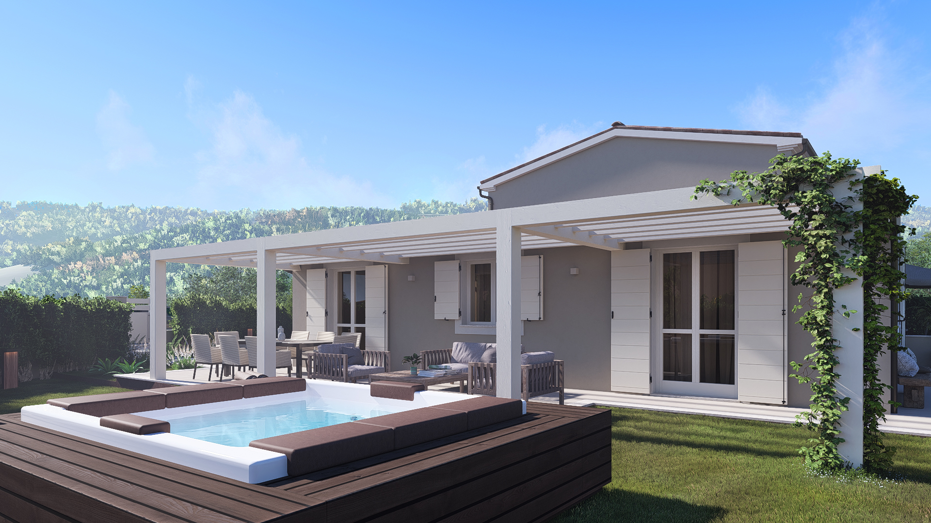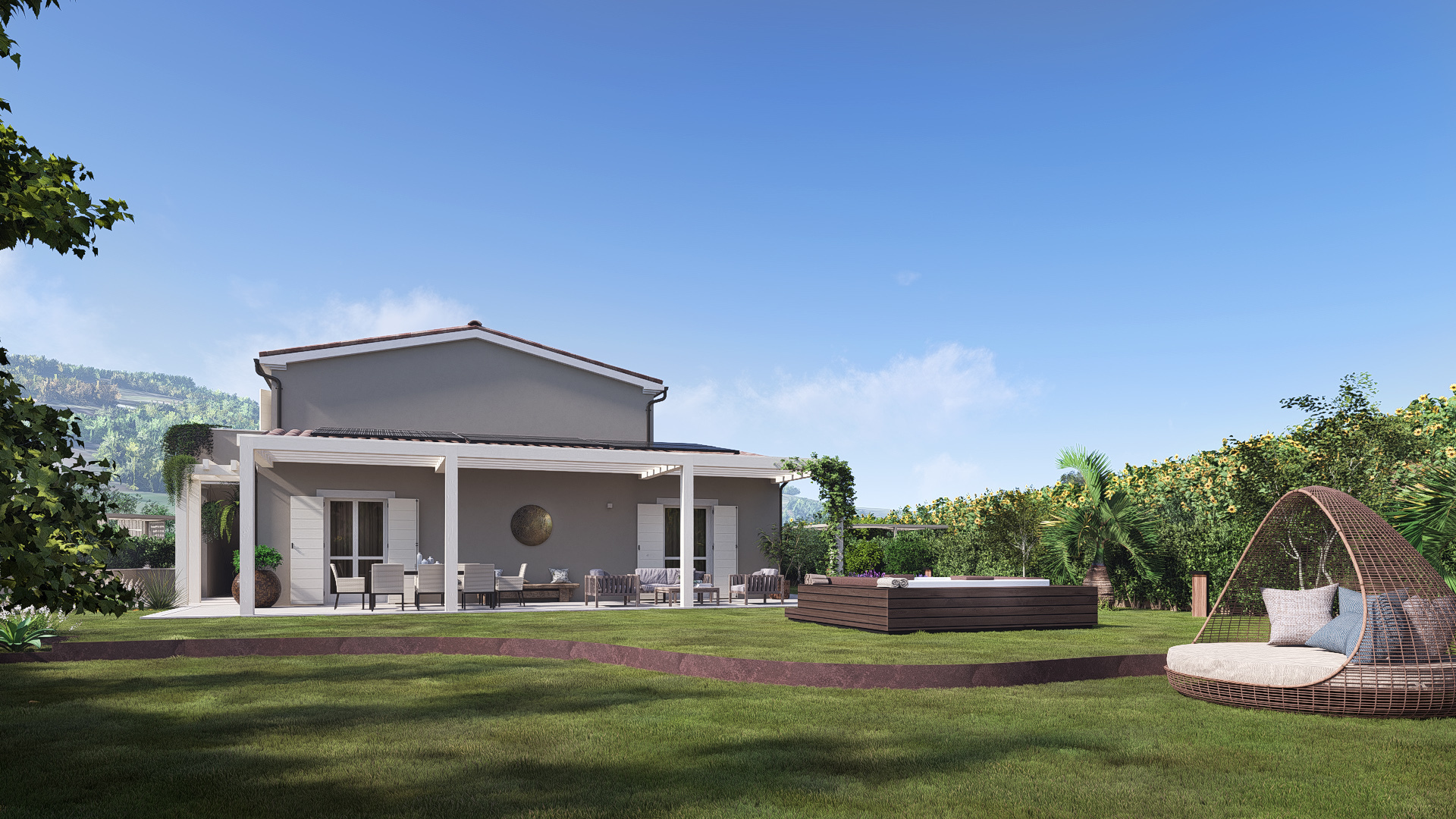 Nello specifico Villa Alba 3 e' una soluzione con ingresso indipendente e un grande giardino di mq 415. Internamente la soluzione e' sviluppata su due livelli: al piano terra grande zona living con soggiorno e cucina che si affacciano su un pergolato di circa 30 mq, nella zona notte sempre sullo stesso livello troviamo due camere ampie e due bagni, al piano superiore ulteriore camera con bango La villa gode di una grande porzione di giardino tale da avere un cancello con il quale e' comodamente possibile entrare con le auto. Internamente le finiture possono essere scelte da capitolato sono previsti travi a vista, la cosa speciale e' che e' ancora possibile progettare le divisioni interne a seconda delle proprie esigenze.