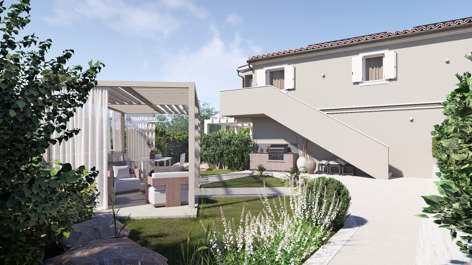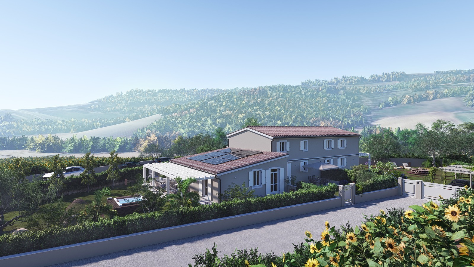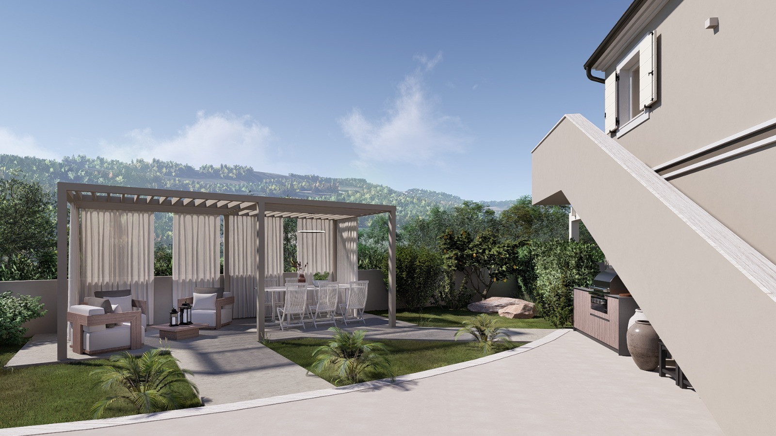 La villa gode di una porzione di giardino tale da avere un cancello con il quale e' comodamente possibile magiare all'esterno e godersi le varie stagioni dell'anno in tutta serenita'. Internamente le finiture possono essere scelte da capitolato sono previsti travi a vista, la cosa speciale e' che e' ancora possibile progettare le divisioni interne a seconda delle proprie esigenze.