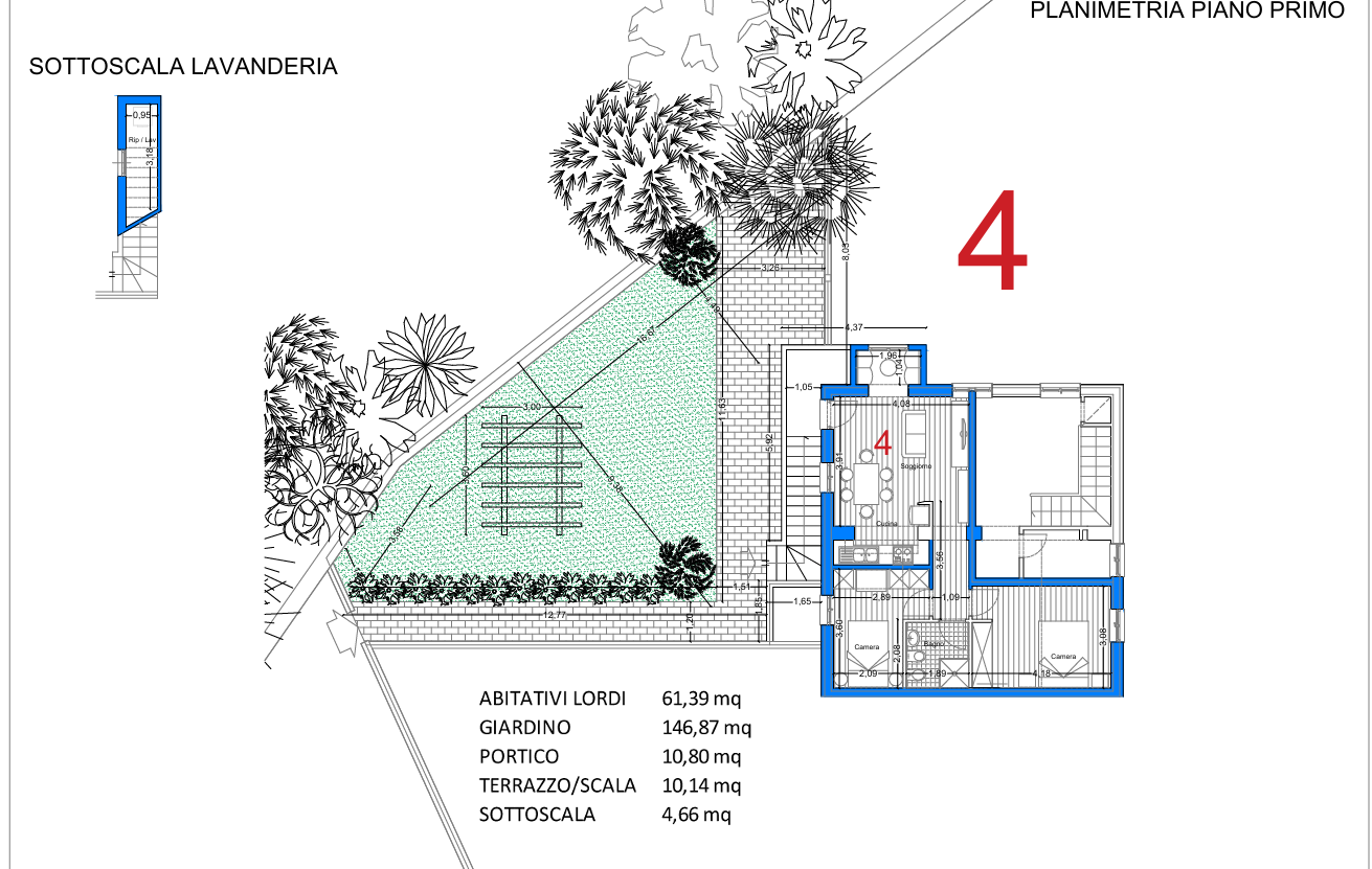 Nello specifico Villa Alba 4 e' una soluzione con ingresso indipendente e un grande giardino di mq 146 dotato di piccolo portico dove puo' essere realizzato un angolo cottura per l'esterno, una piccola cantina e con una scala caratteristica che rievoca la colonica marchigiana accediamo al piano primo.