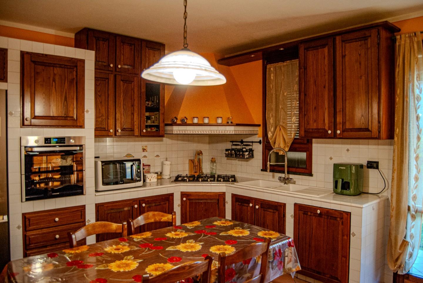Al piano terra, un soggiorno spazioso e luminoso è collegato a una cucina completa di zona pranzo, dalla quale si accede direttamente al giardino privato, oltre a un comodo bagno di servizio.