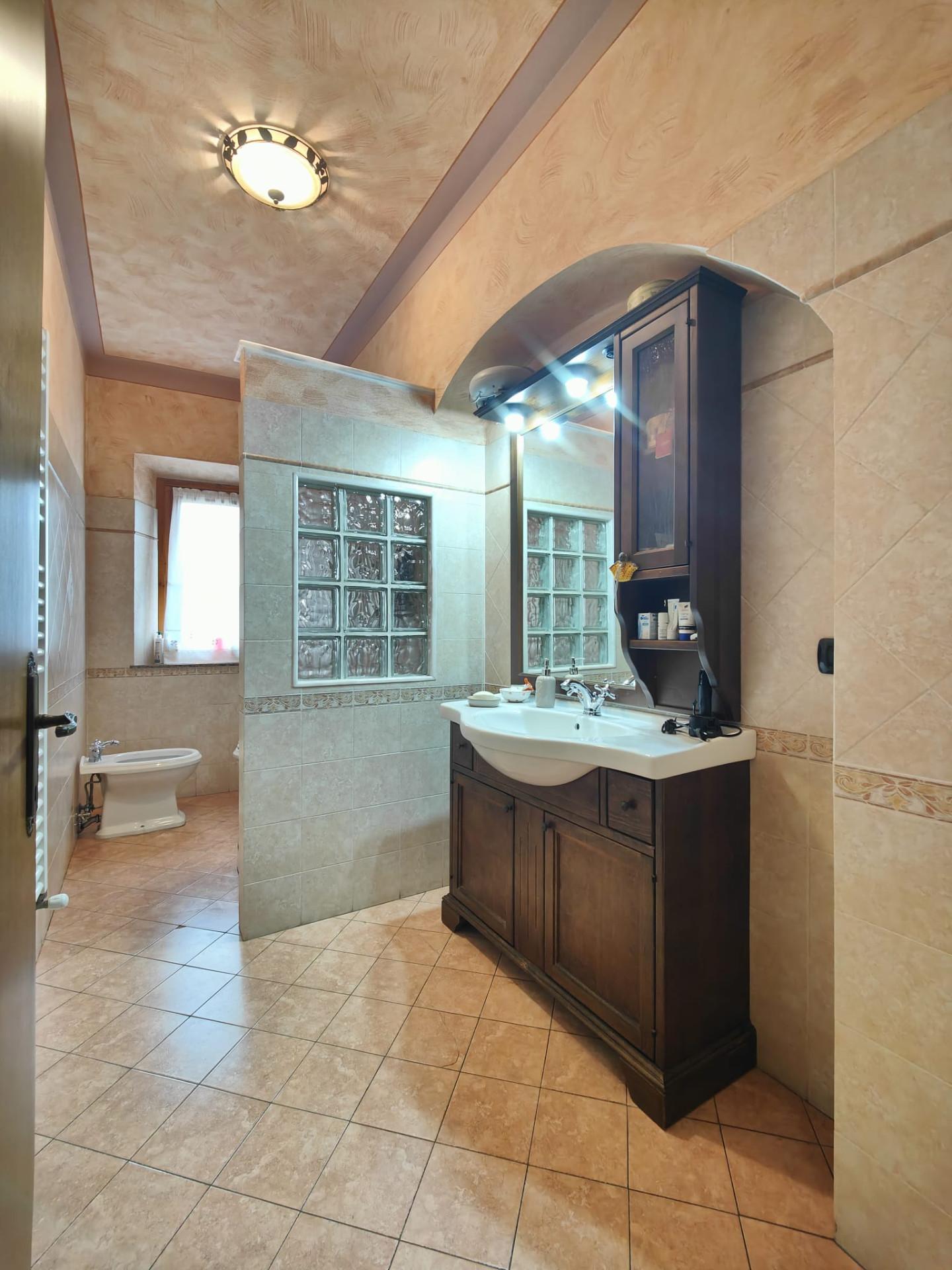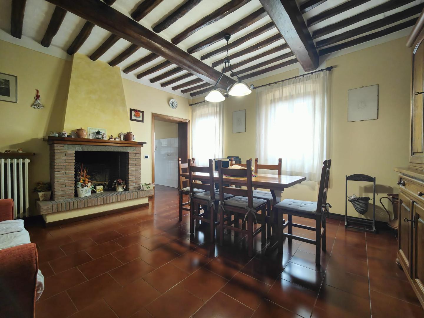 Piano primo, collegato da scala interna: sala da pranzo con camino, cucinotto, ripostiglio, salotto utilizzabile anche eventuale terza camera, due bagni e due ampie camere da letto, con soffitti in travi di legno a vista.