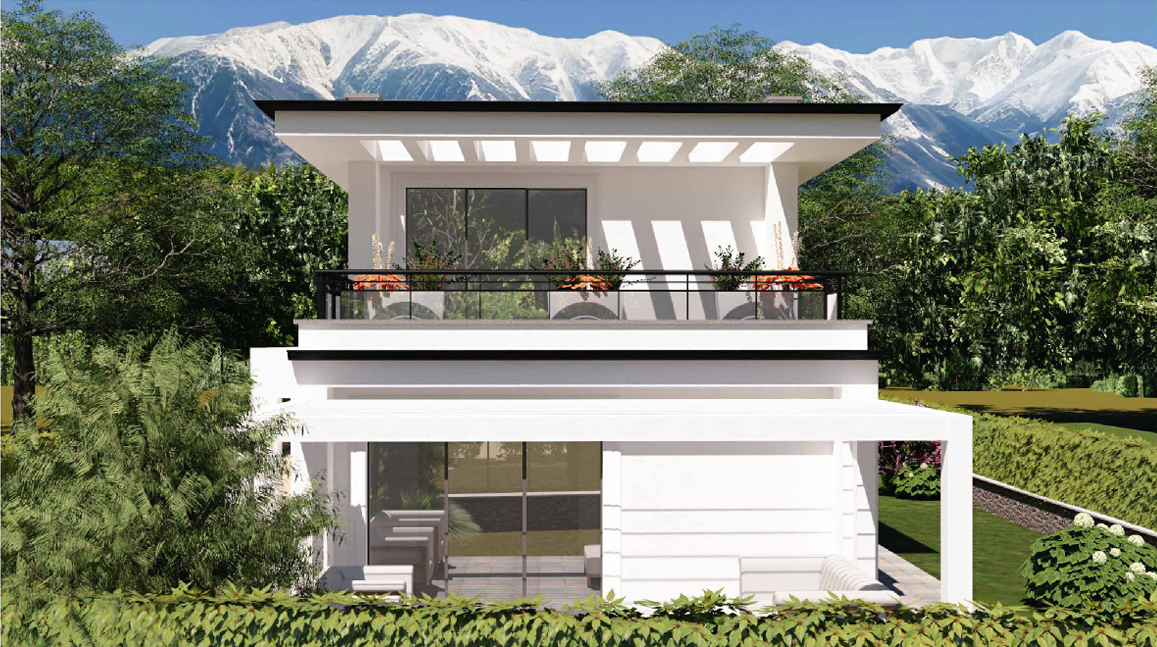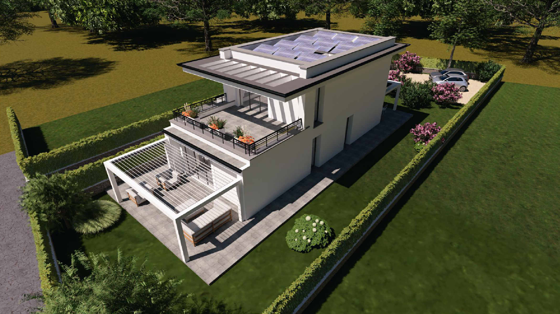 E' stata predisposta un'ipotesi di progetto in base alla cubatura utile che si sviluppa su due piani: al piano terra si compone di ingresso, soggiorno con accesso a pergola esterna che gode di una bellissima esposizione sud ovest, ampia cucina pranzo con accesso esterno a pergola per piacevoli pranzi all'aperto e un comodo bagno; al piano primo abbiamo la zona notte con grande camera matrimoniale (20 mq) con accesso a terrazza, seconda camera di 13 mq con accesso a terrazza di 23 mq, disimpegno e bagno.
