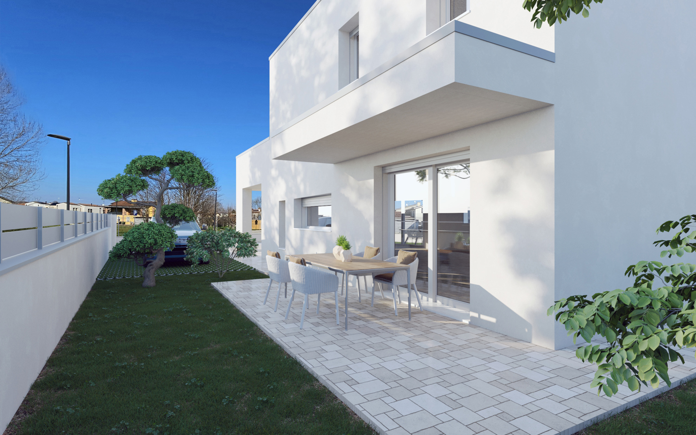 Ogni unit completata da giardino privato e posto auto esterno, garantendo spazi dedicati alla vita allaperto e alla praticit quotidiana.