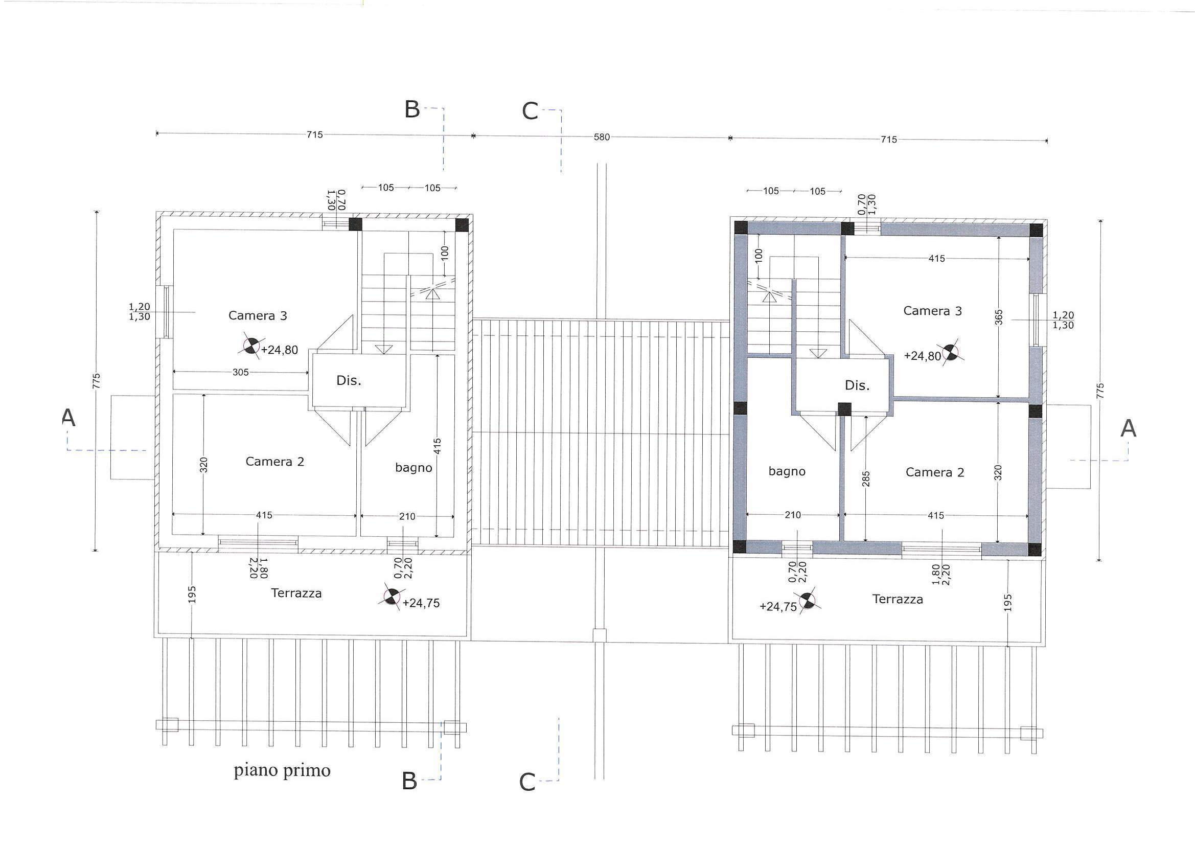 Al piano primo disimpegno, due camere matrimoniali, bagno.