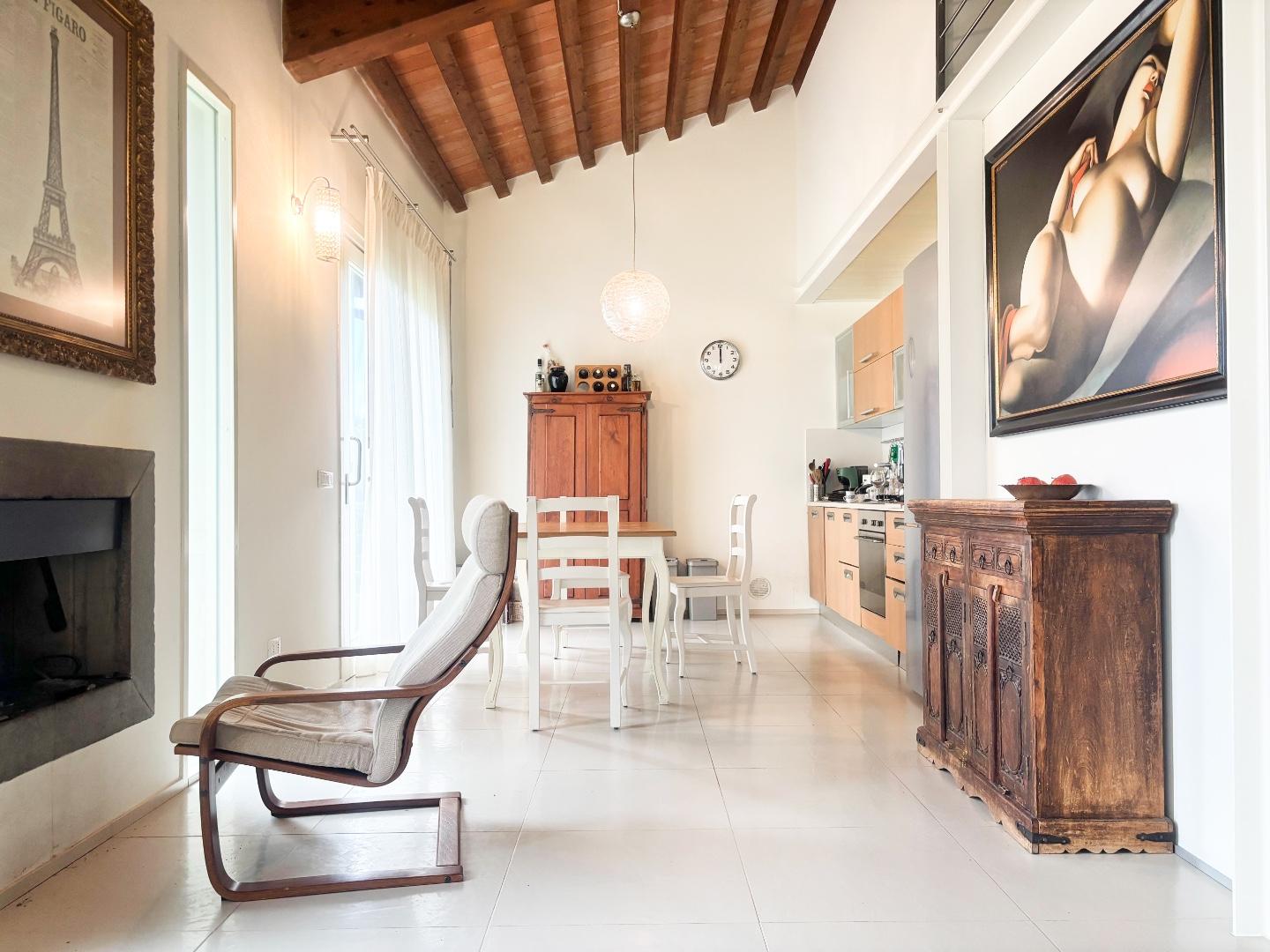 Soppalco: Una scala d'arredo in metallo di design conduce dal salotto al piano superiore, dove un ampio e suggestivo soppalco si presta perfettamente come studio, zona relax o secondo salotto.