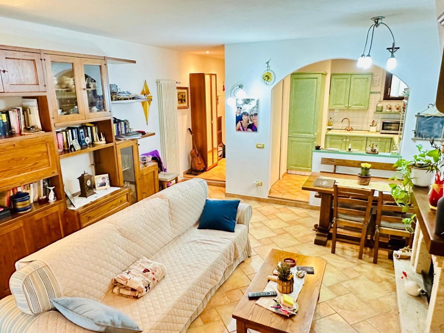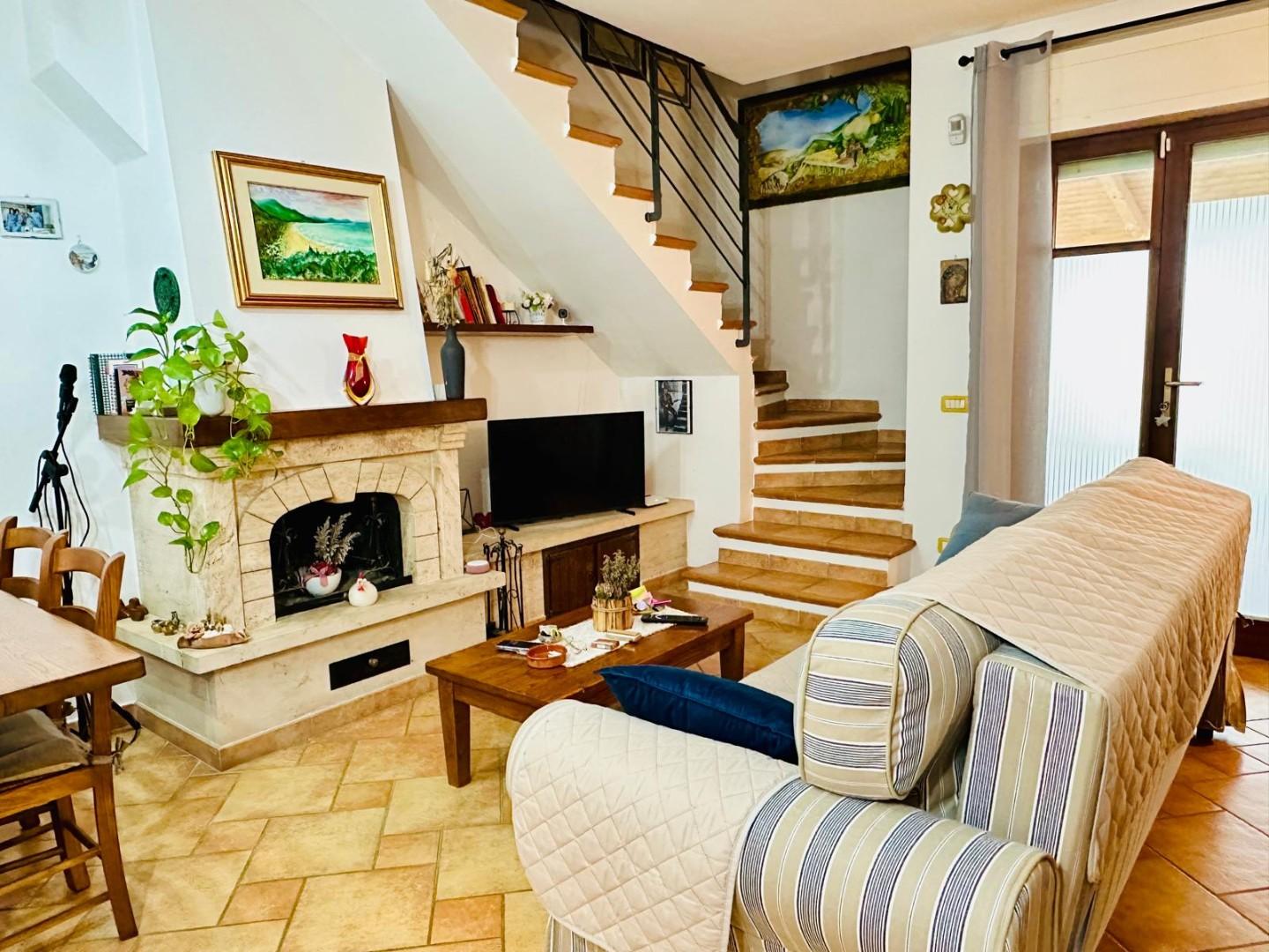 La zona giorno al piano terra si compone di un grande soggiorno con caminetto e terrazza vivibile coperta, una cucina con piccola dispensa, un bagno di servizio finestrato.