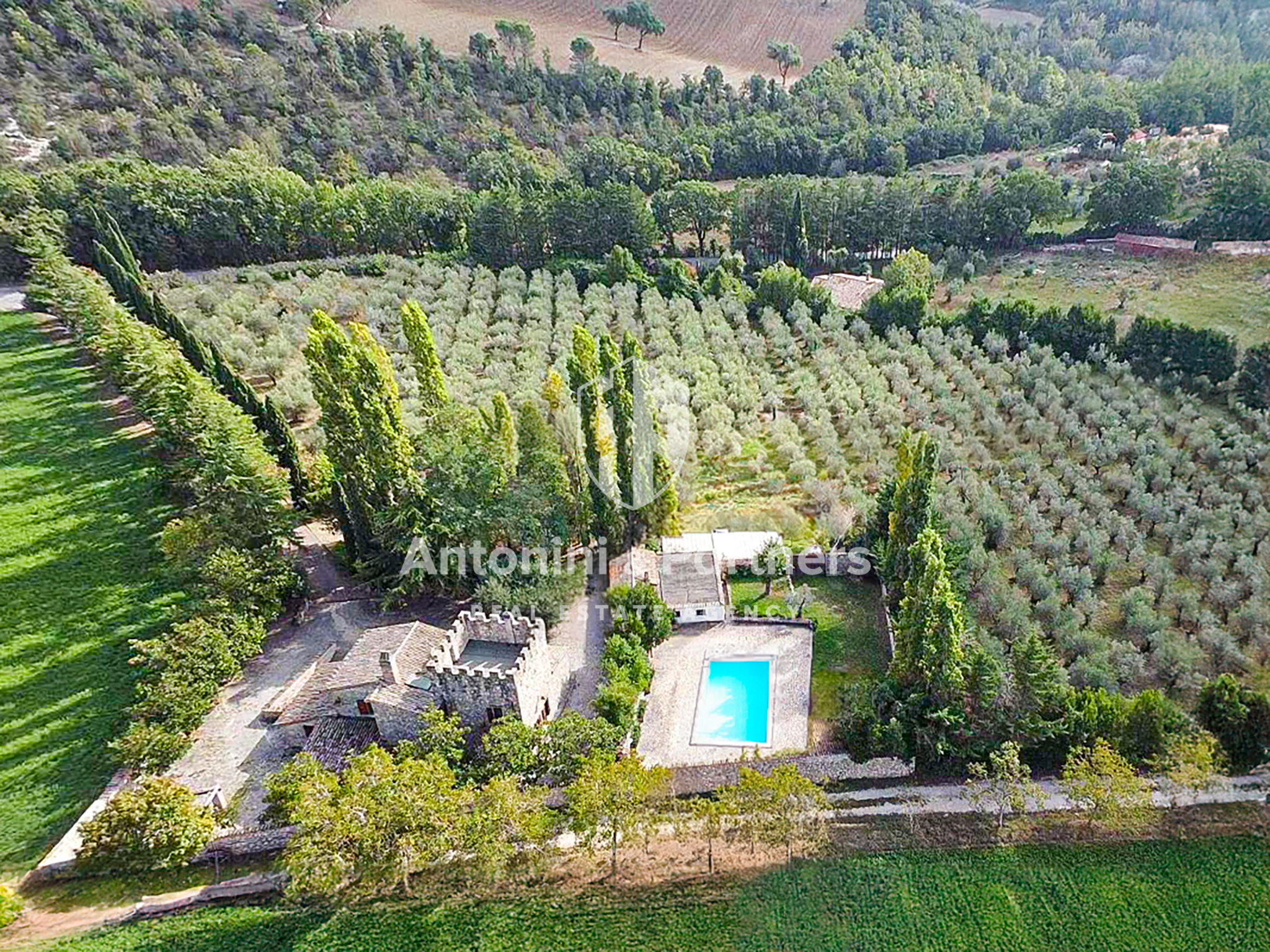 Una proprietà esclusiva che si compone del casale principale (di 320 mq), un secondo edificio (di 94 mq), adibito a magazzino/cantina, un'ampia corte esterna con piscina e un grande appezzamento (12756 mq) di terreno agricolo.