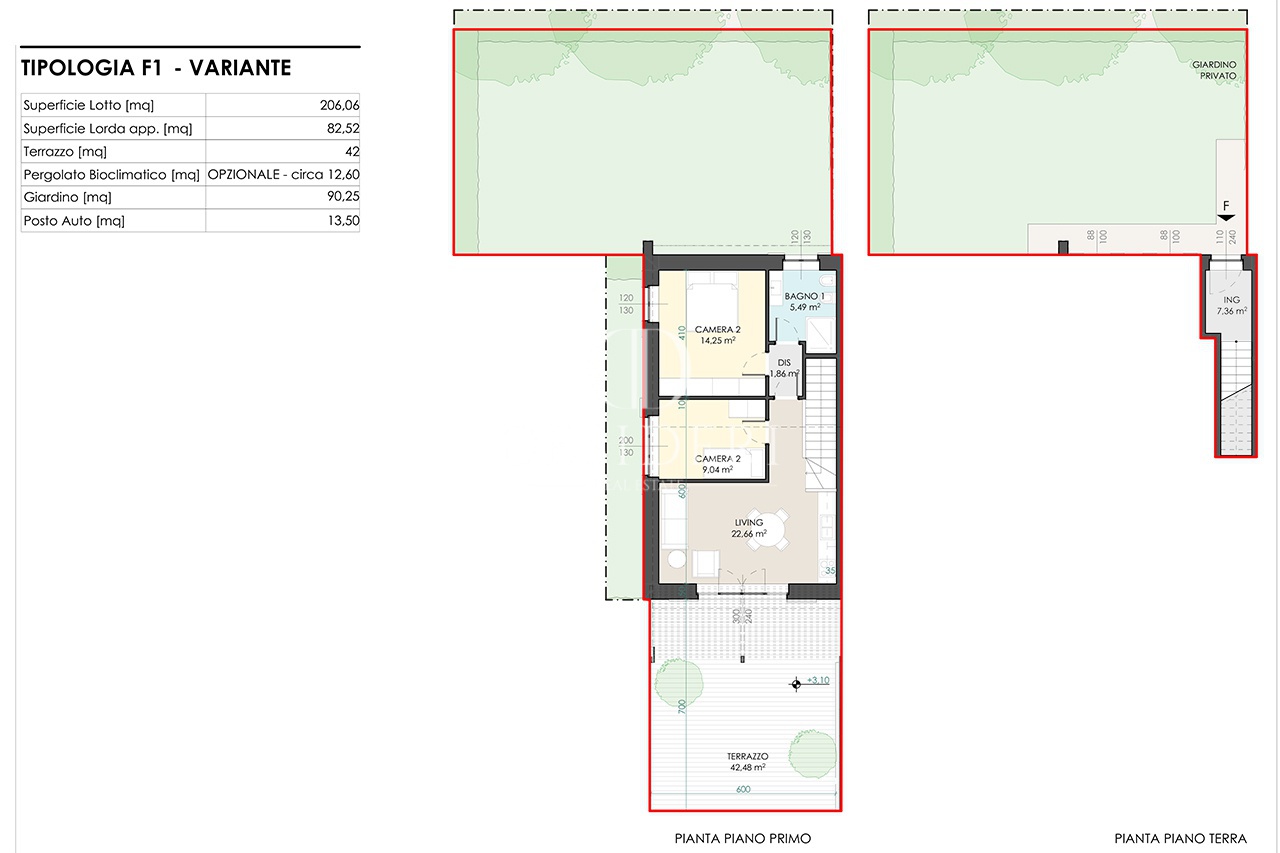La tipologia di appartamento è concepita su due livelli con una metratura totale di 82 mq. Internamente si sviluppa nel seguente modo: al piano terra un ampio giardino di mq. 90, mentre al primo piano si accede all'appartamento dove troviamo una zona living con area pranzo e angolo cottura con ampio terrazzo di mq. 42 con pergolato bioclimatico di 12 mq., un bagno e due camere da letto.