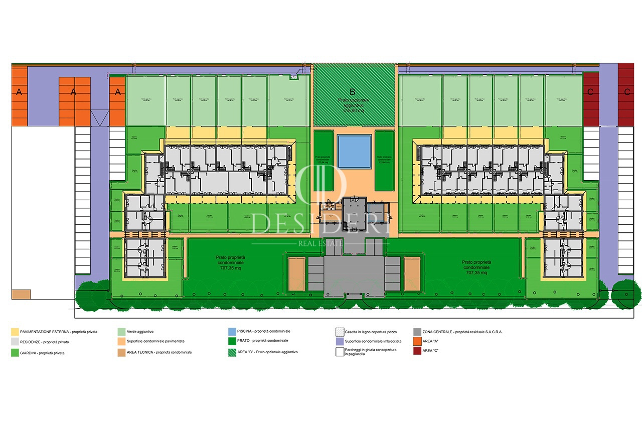Il progetto prevede la realizzazione di appartamenti su uno o più livelli, oltre a spazi comuni, con piscina ad uso esclusivo dei proprietari e locali di servizio ad essa relativi.