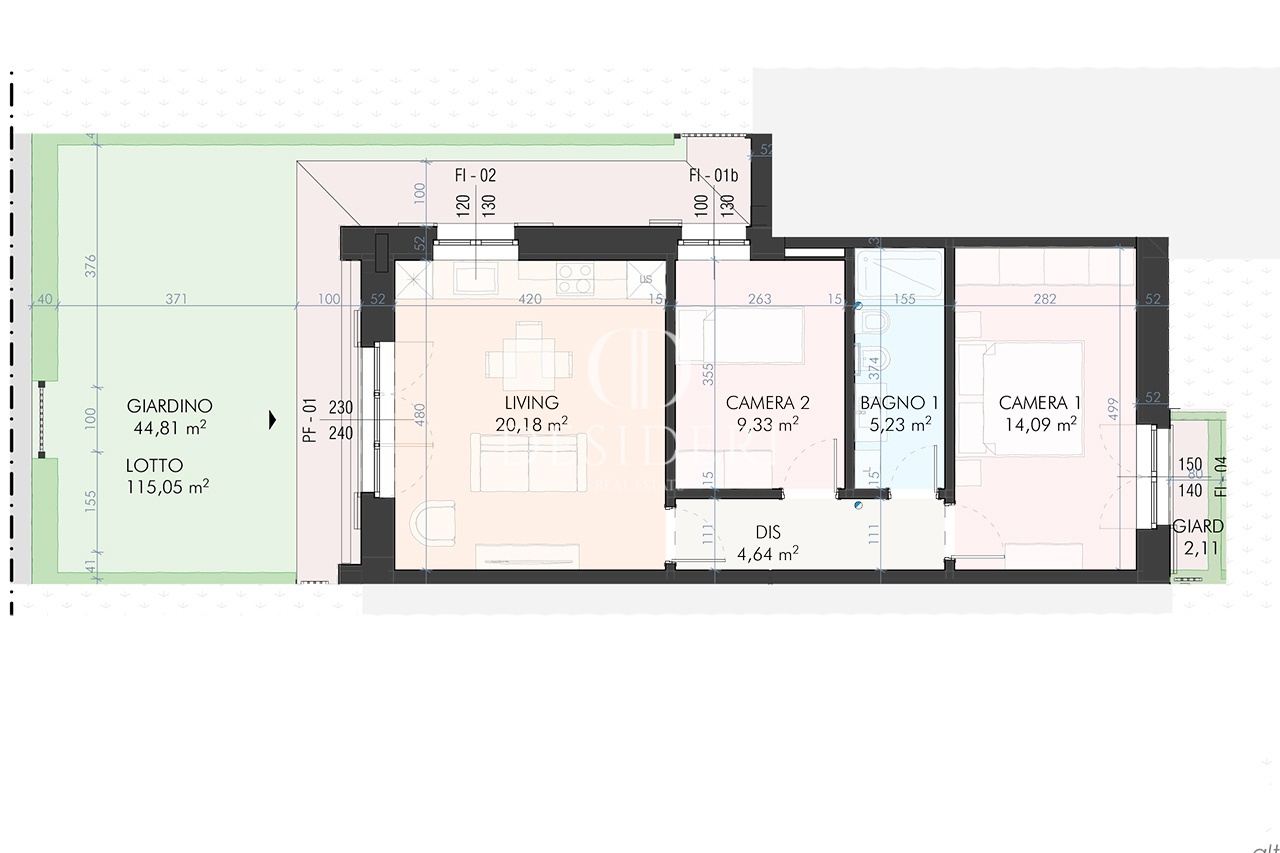 La tipologia di appartamento "D" è concepita su un unico livello con una metratura totale di 67 mq. Internamente si sviluppa nel seguente modo: al piano terra, ingresso tramite giardino privato di mq. 52 su living con zona pranzo e angolo cottura, un bagno e due camere da letto.