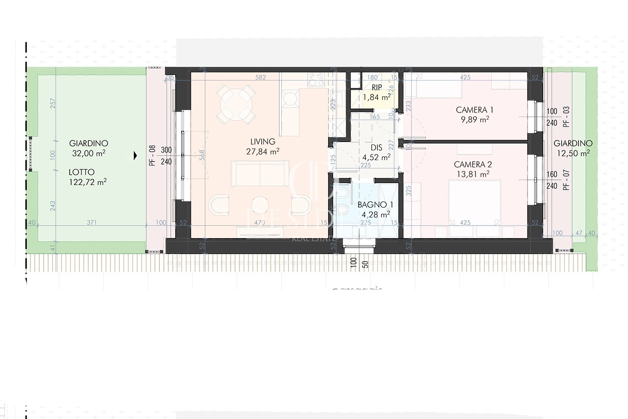 La tipologia di appartamento "E3" è concepita su un unico livello con una metratura totale di 79 mq. Internamente si sviluppa nel seguente modo: al piano terra, ingresso tramite giardino privato di mq. 31 su living con zona pranzo e angolo cottura, un bagno, un ripostiglio e due camere da letto dotate di giardino privato di 11 mq. Completa la proprietà due posti auto di mq. 27 e un area privè piscina.